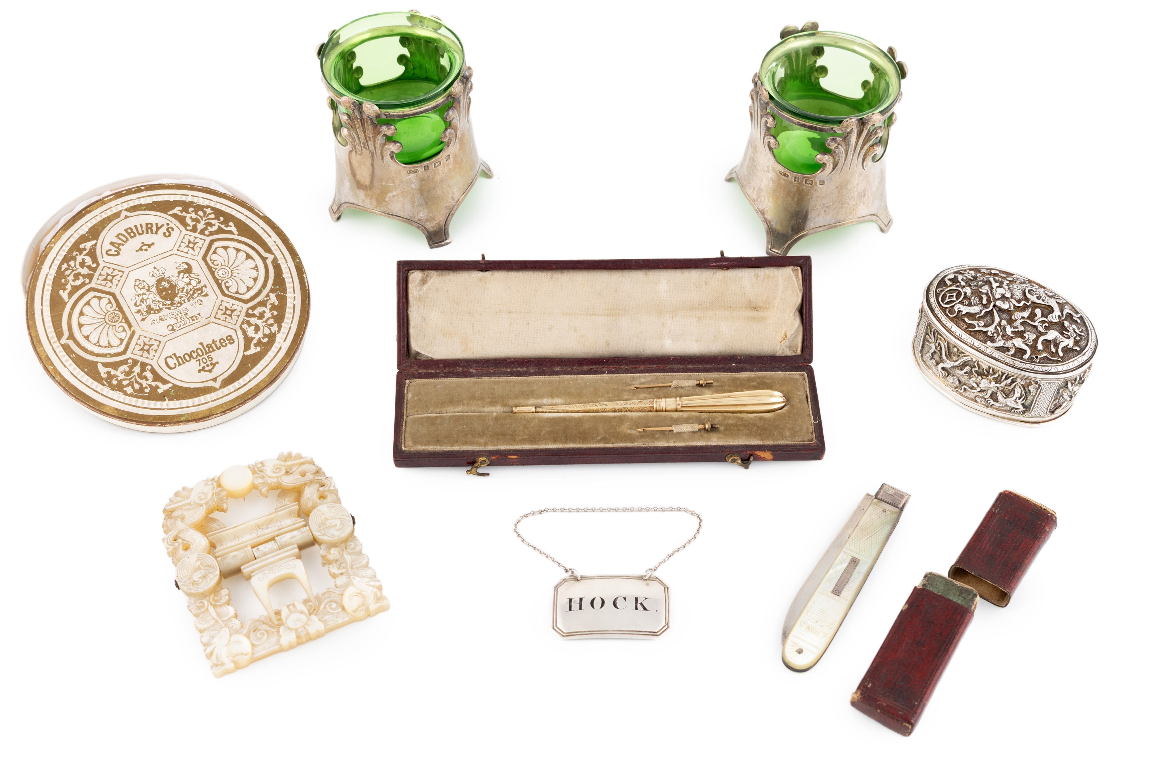 comprising silver items: a pair of vases, by Robert Catterson-Smith, shaped circular form, with foliate motifs, green glass liners, height 6.5cm, plus a wine label, maker's mark I.B, incised and blackened 'Hock', a Chinese box, a cased fruit knife, plus a cased gilt-metal crochet tool and a carved mother-of-pearl buckle, approx. weighable 7.4oz. (qty)