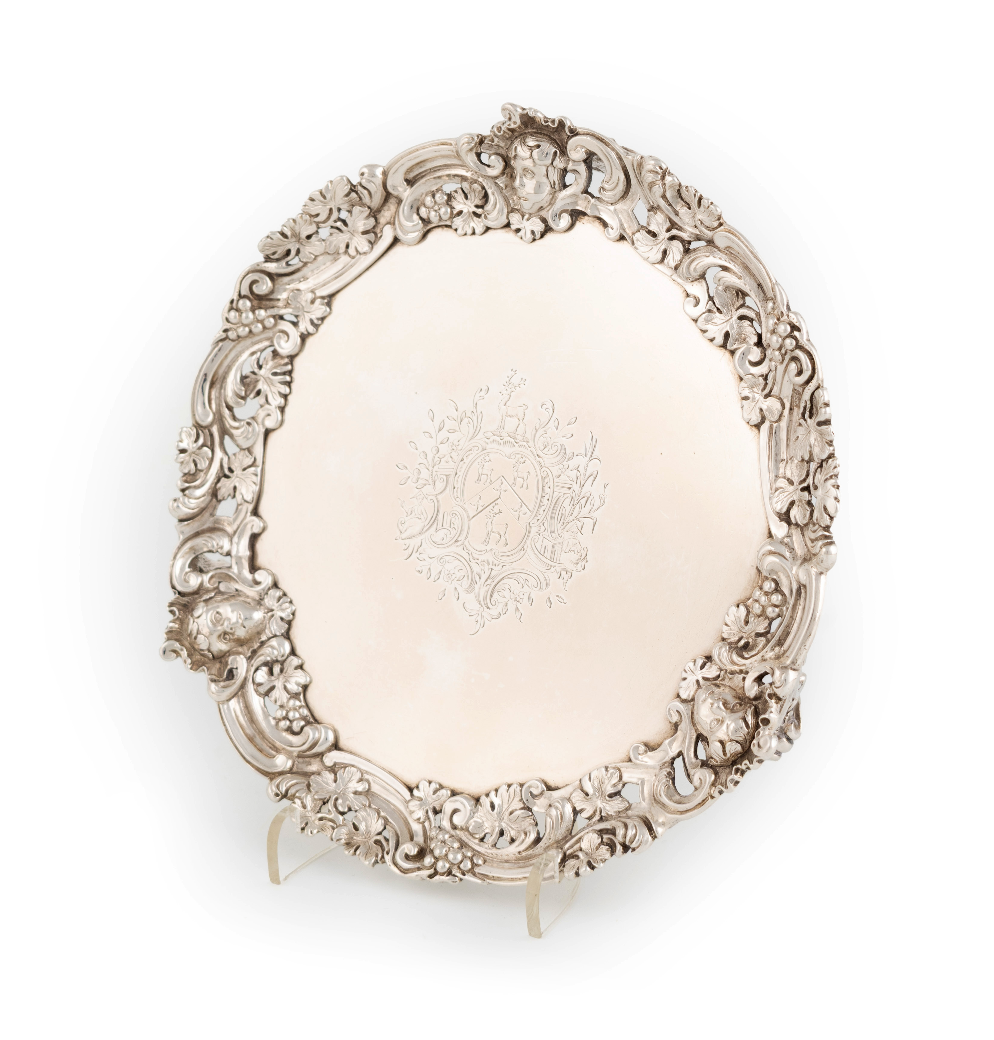 circular form, the centre engraved with an armorial within foliate scroll mantling, with a cast border with trailing grapevines, and masks, on three pierced foliate bracket feet, diameter 17cm, approx. weight 12.8oz.