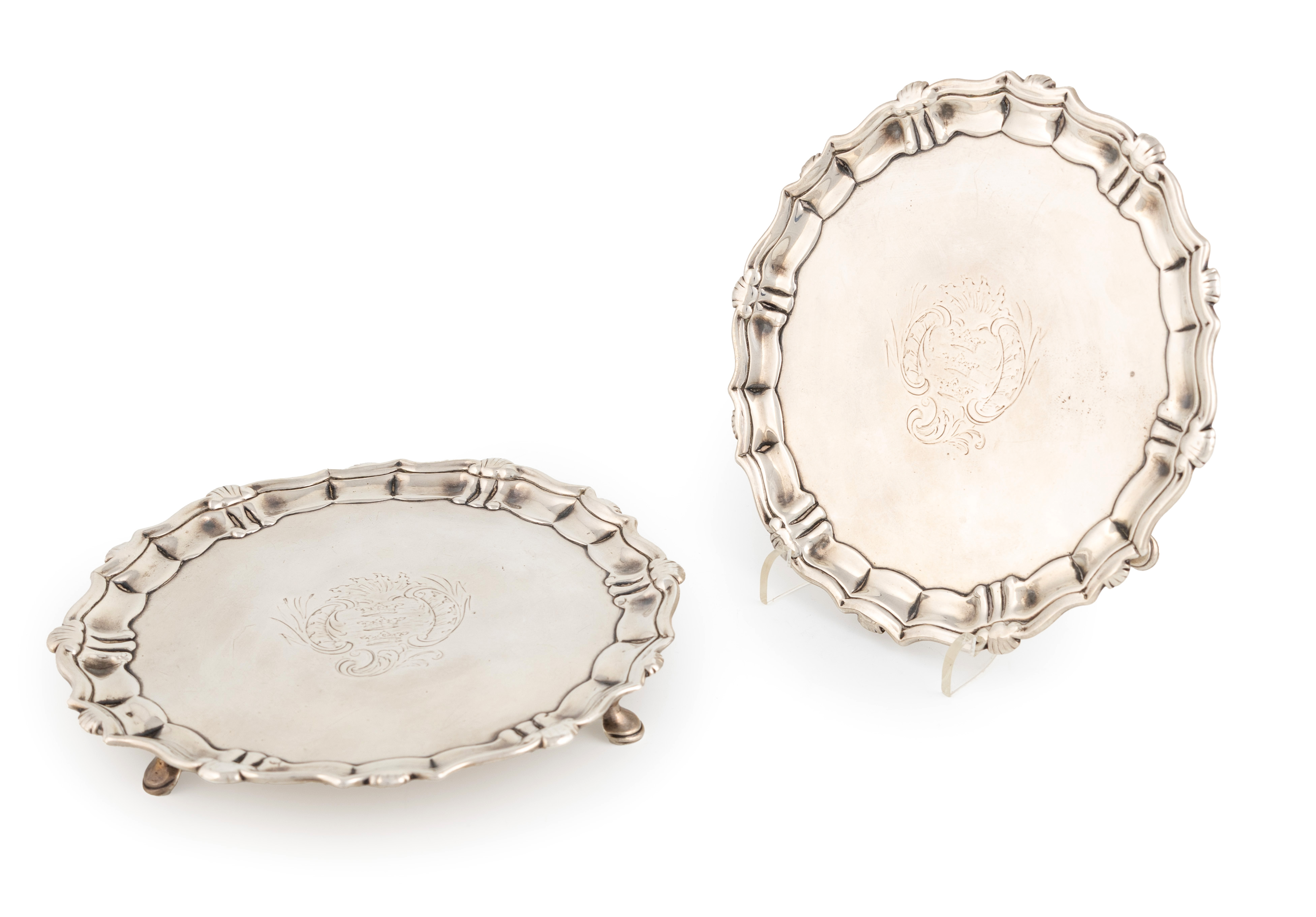 circular form, shell and scroll border, the centre with the arms of Hull within foliate scroll mantling, on three hoof feet, the reverse of one inscribed 'Corporation Waiter', the reverse of the other inscribed 'The waiters purchased by John Wray at the Sale of the Plate of the Corporation of Hull, in memory of the many members of his Family who during a period of more than a century had at different times served the Office of Mayor, Recorder and Sheriff', diameters 15.9cm and 16.1cm, approx. weight 15oz. (2)