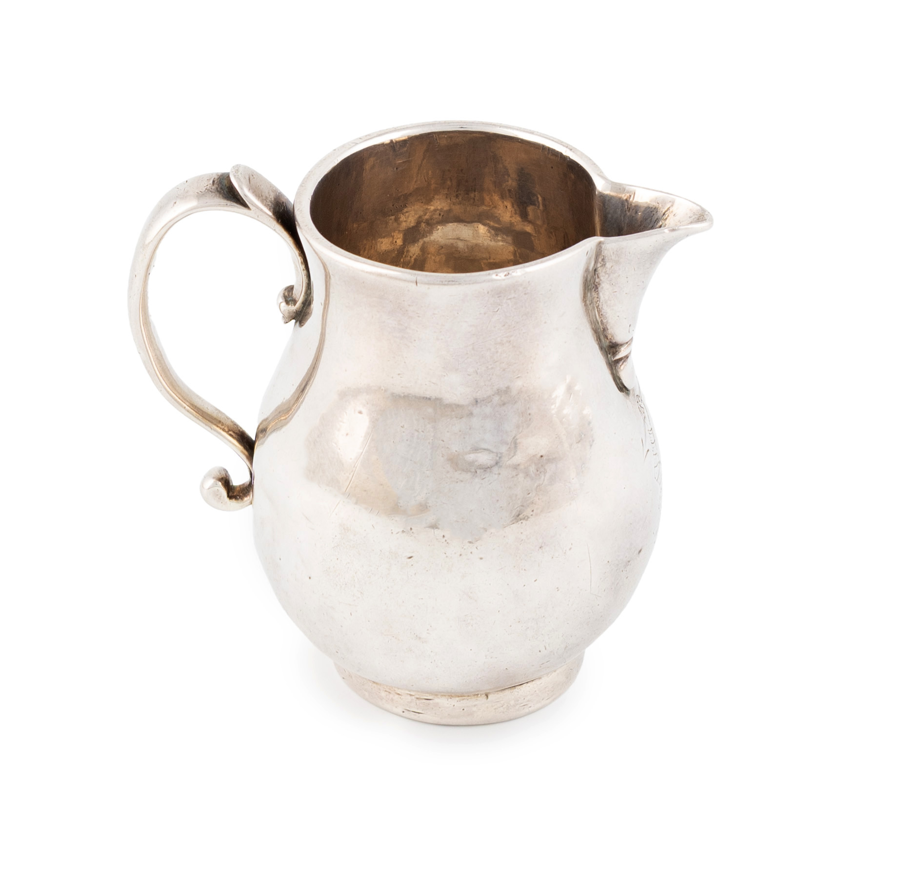 A George I silver 'sparrow-beak' cream jug,by William Fleming, London 1719,baluster form, engraved