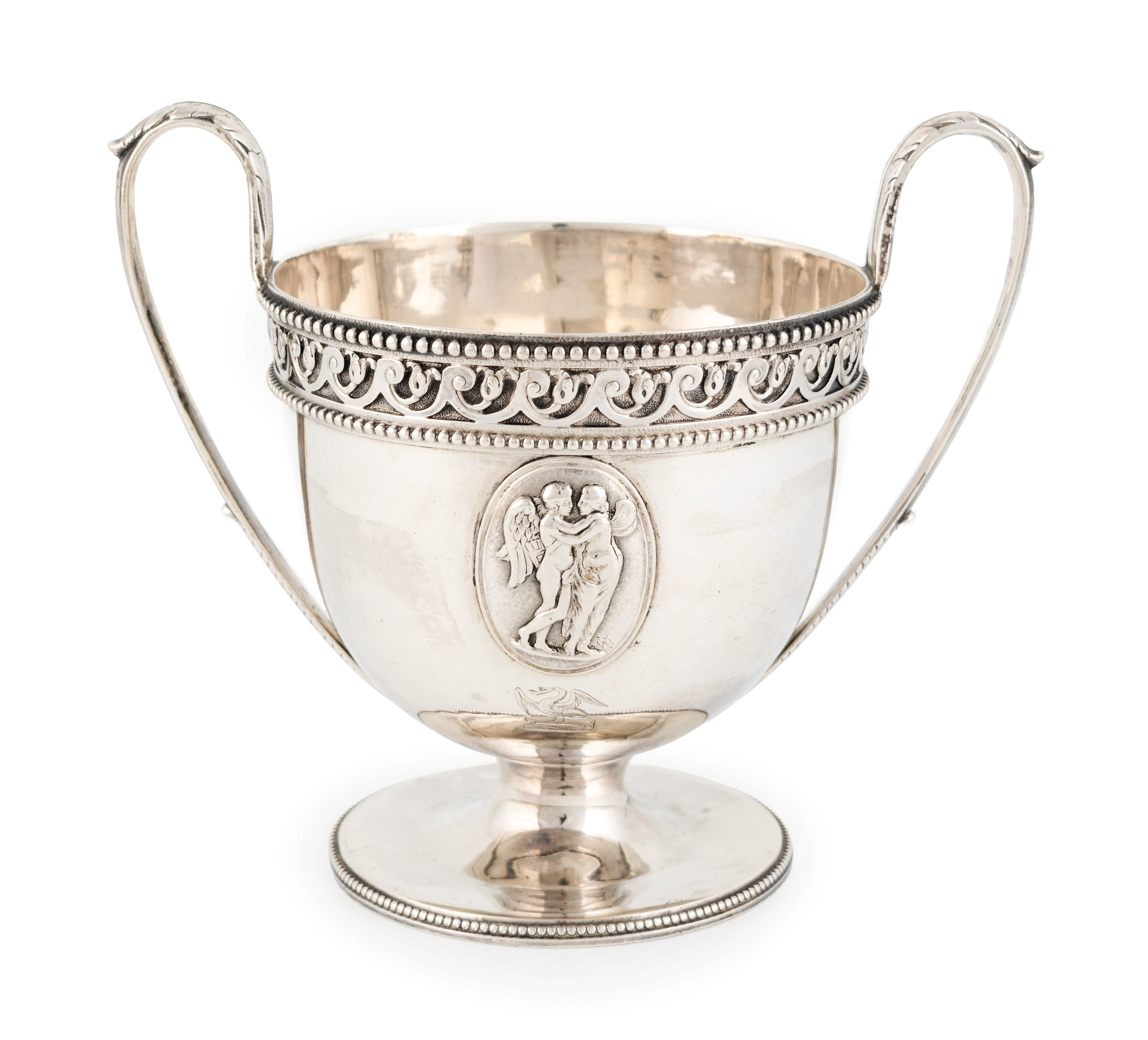 circular form, leaf-capped scroll handles, with a classical frieze, beaded borders and applied with two classical oval plaques, on a raised circular foot, height 14.3cm, approx. weight 14oz.