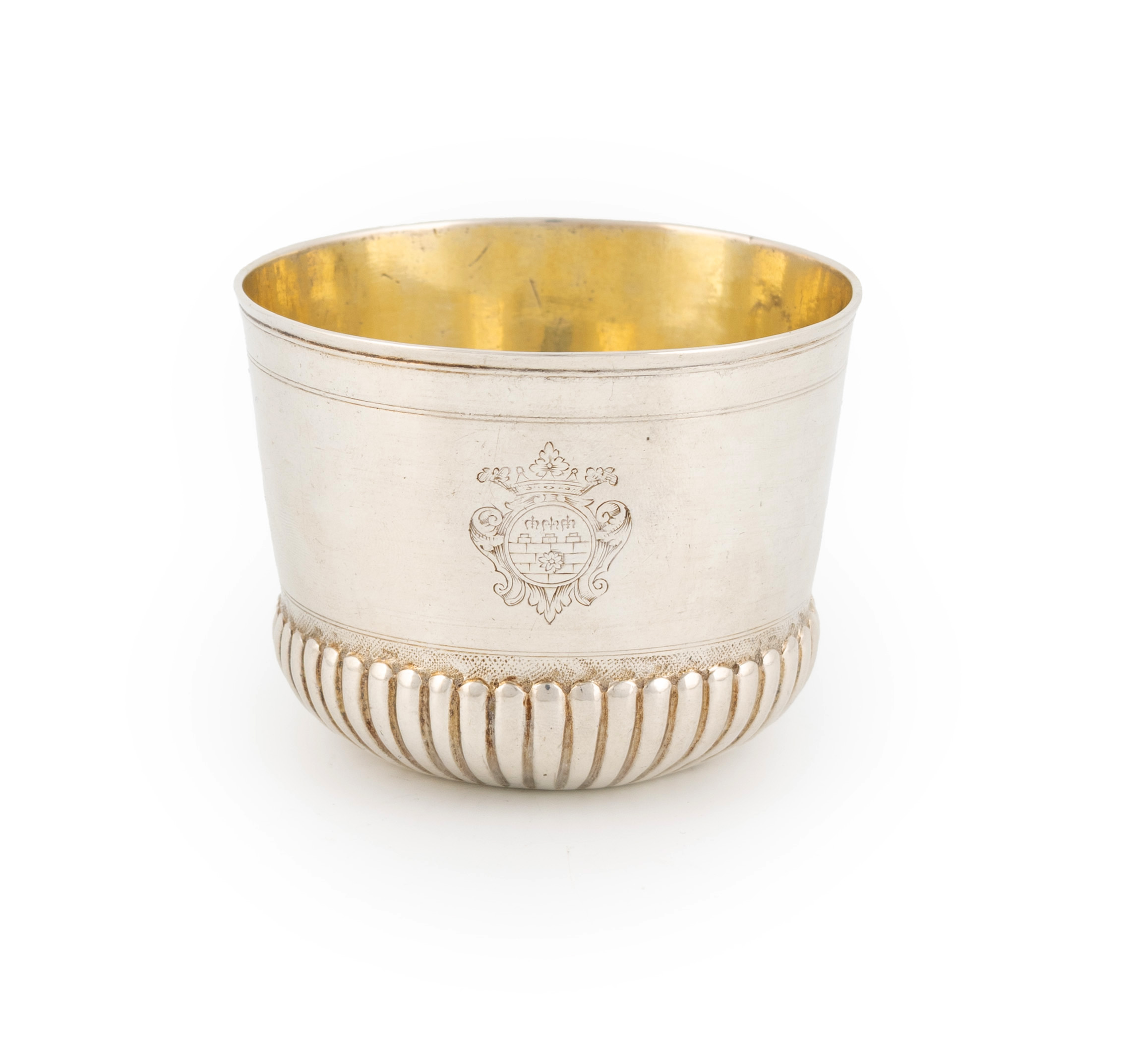 tapering circular form, with fluted decoration, gilded interior, engraved with a crest within foliate mantling, height 5.7cm, approx. weight 2.7oz.