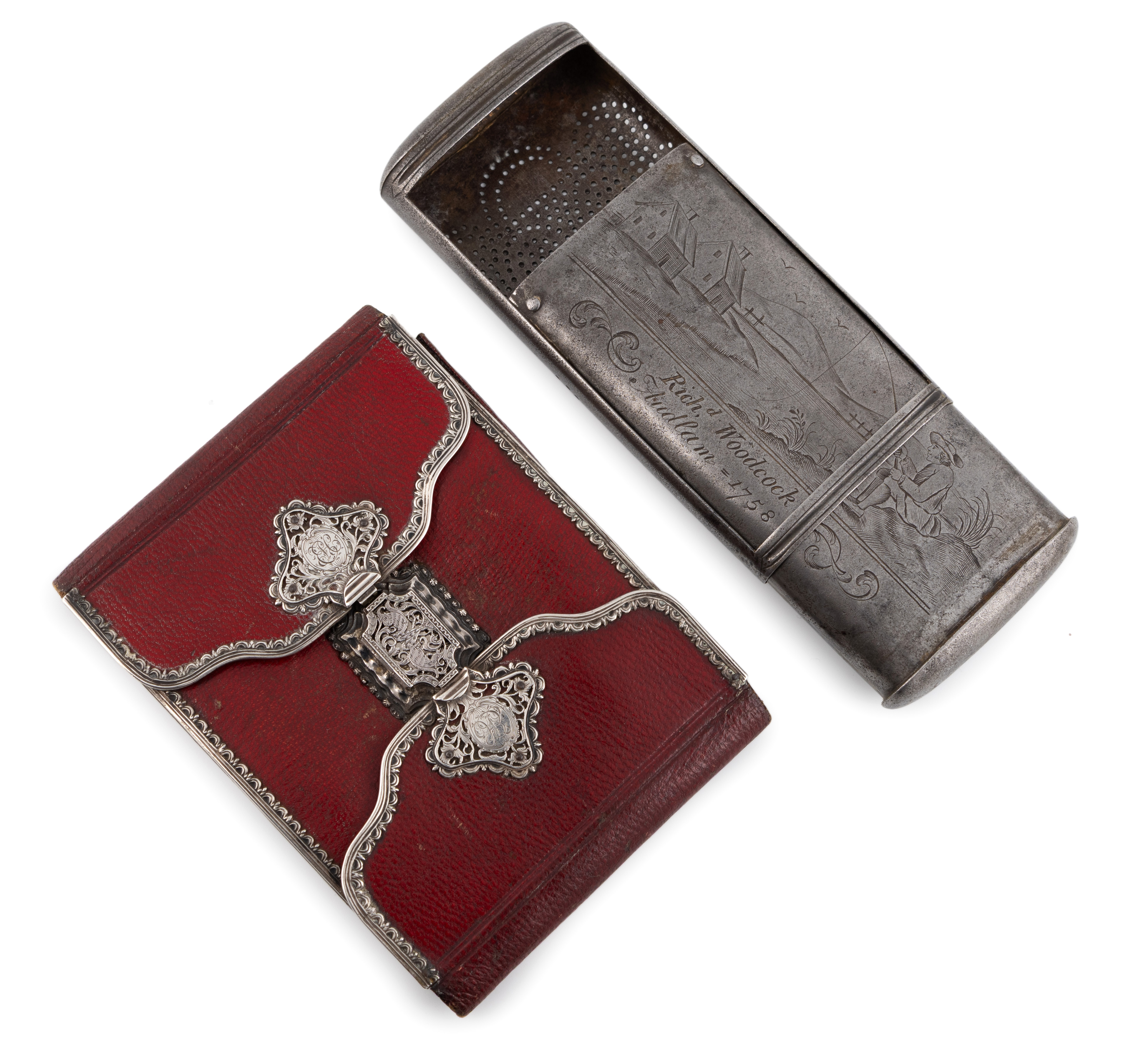 rounded rectangular form, the slide-action cover engraved with a man on a riverbank fishing, and inscribed 'Rich,d Woodcock Audlam 1758', pierced base, length 12.7cm, plus a George III silver-mounted red leather wallet, unmarked, pierced borders, the two flaps with locks, (no key), initialled, length 12.2cm. (2)