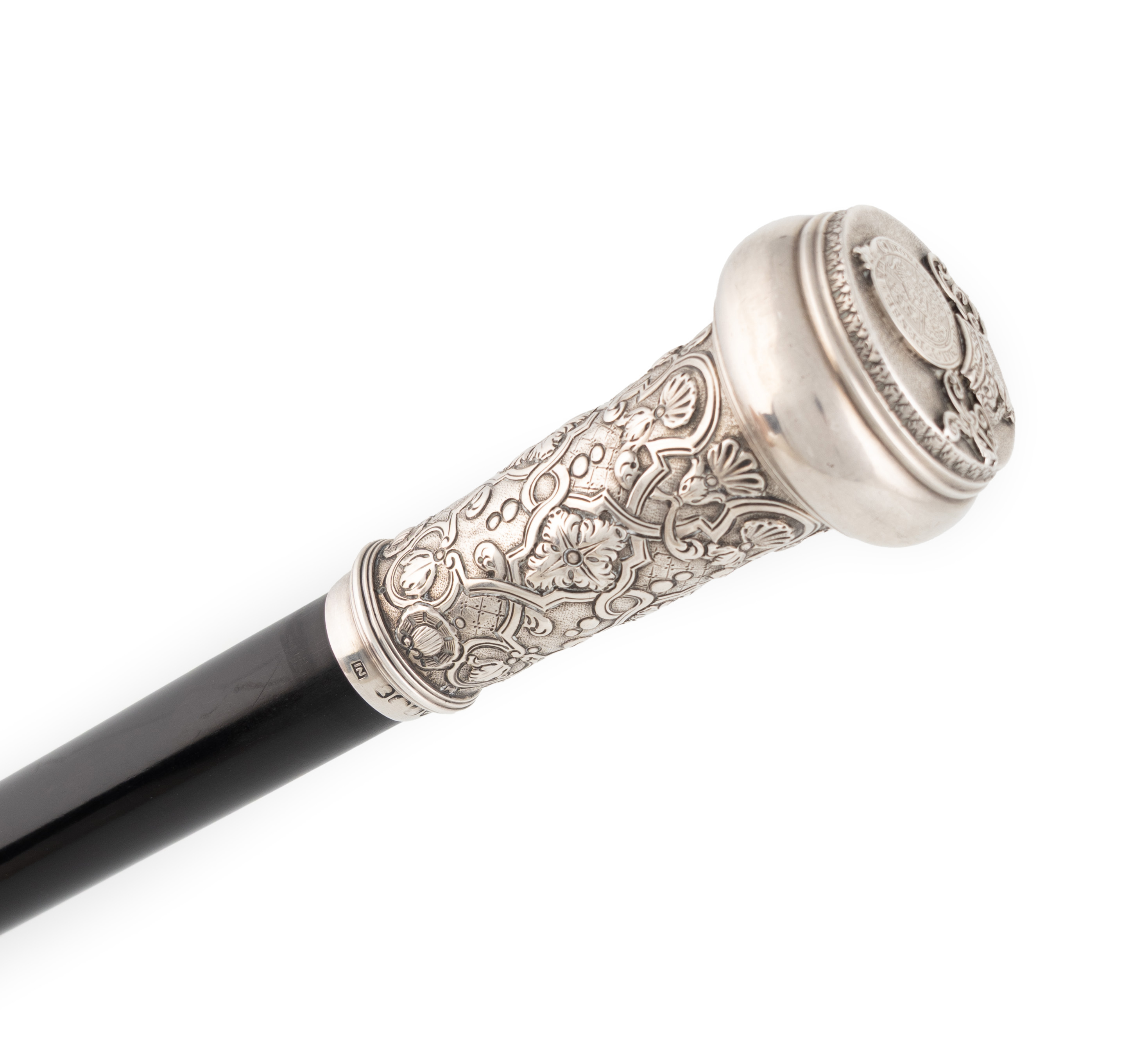 the tapering handle with chased foliate and shell decoration, the top applied with the Royal cypher GR with a crown between and with the Royal arms, black tapering shaft, with a silver ferrule, length 95cm.