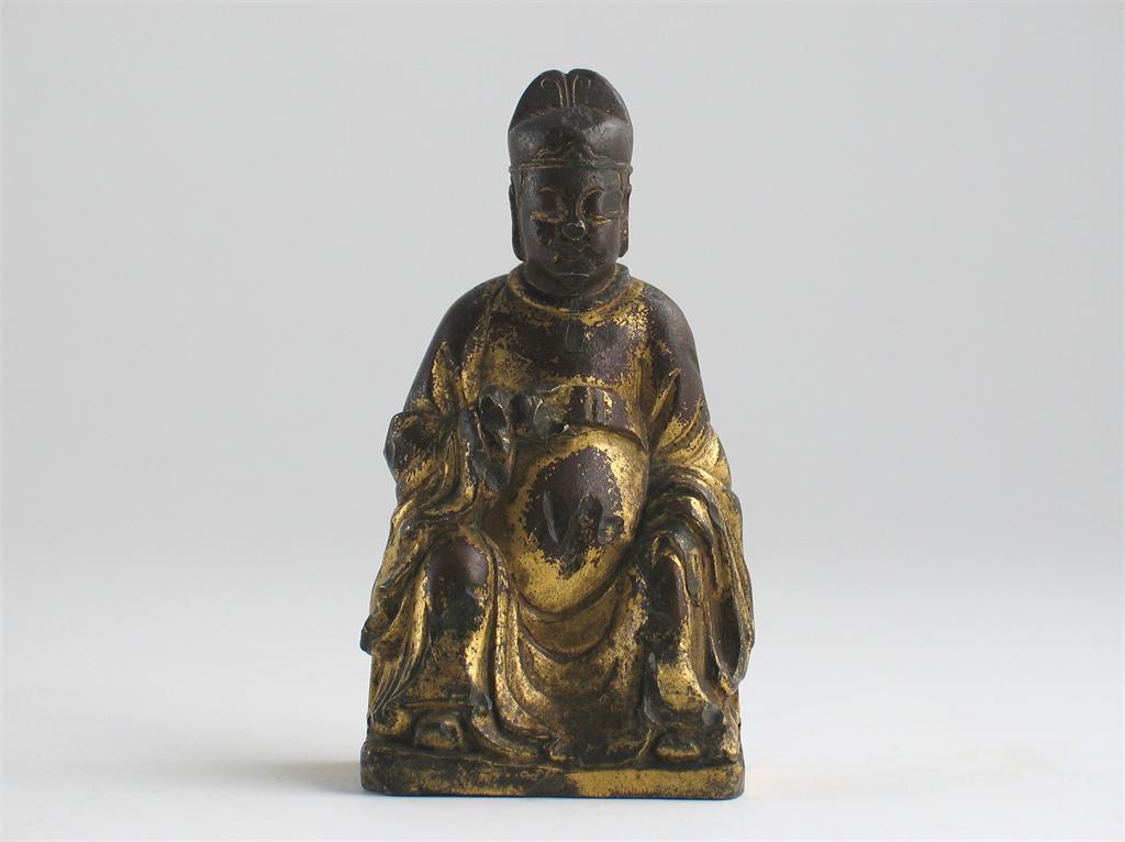 A Chinese gilt bronze seated figure of Guan Ti. Some wear. 17th century, 9cm.