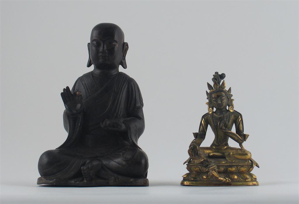 A Tibeto-Chinese gilt bronze figure of Tara, seated in lalitasana mudra on a double lotus throne, 18th century, 11cm. Lotus blossom missing. And a Chinese bronze seated figure of Vaisravana holding a Nakula and a mirobalan, 17th century, 17cm. (2)
