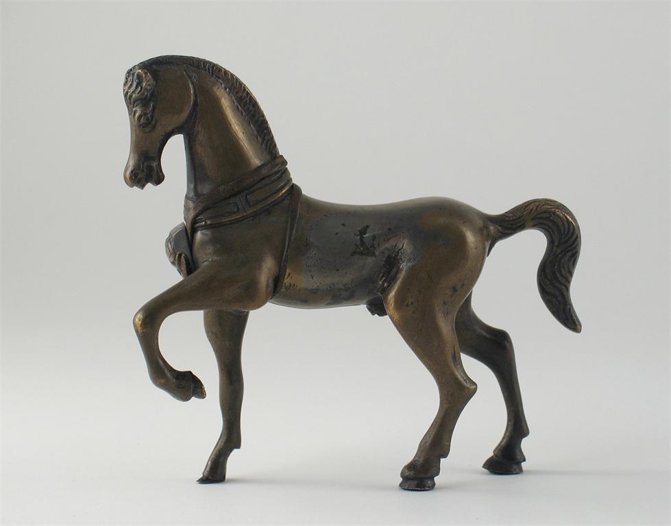 A Middle Eastern cast brass or bronze model of a horse, with one leg raised, 19th/20th century, 14cm.
