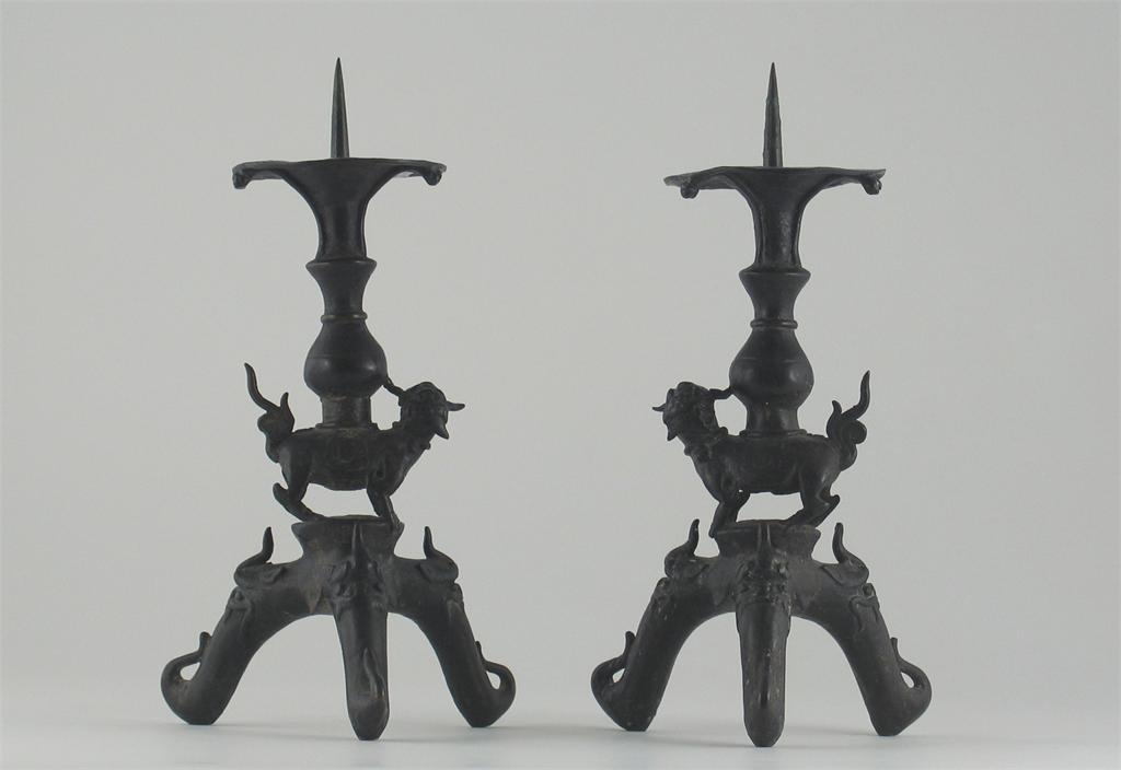 A pair of Chinese bronze tripod pricket candlesticks