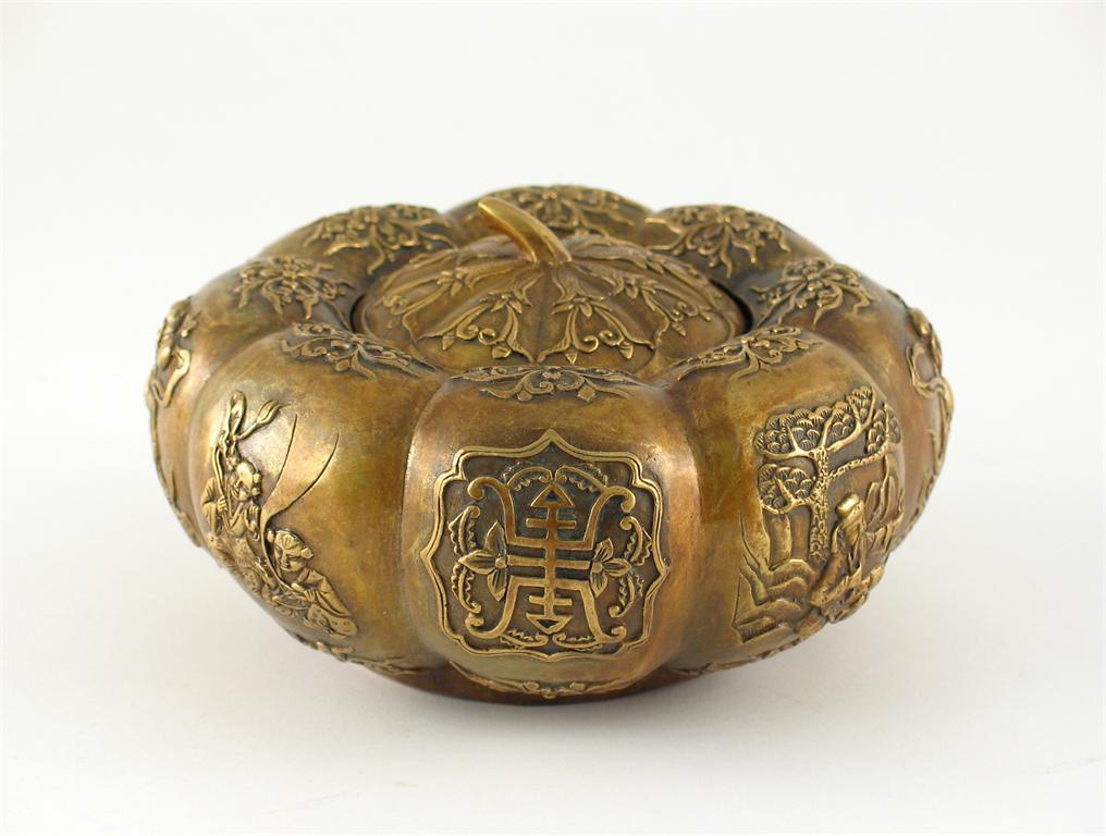 A Chinese bronze vase and cover, formed as a compressed pumpkin, cast with figures and shou characters, the base with a six character Xuande mark, 19th century, 14.5cm. (2)