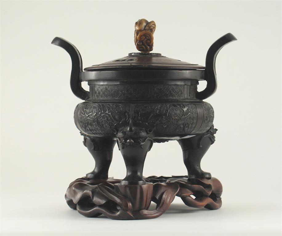 A Chinese bronze tripod censer, with curved handles and taotie masks cast to the body, the wood cover with a carved soapstone knop, raised on an elaborate lotus stand, 17th century, 28.5cm. (3)