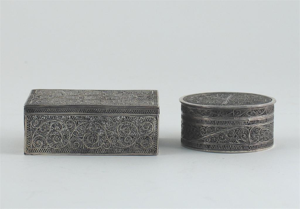 Two silver-coloured metal filigree boxes, the circular box with a removable cover, 19th century, 9cm. (3)