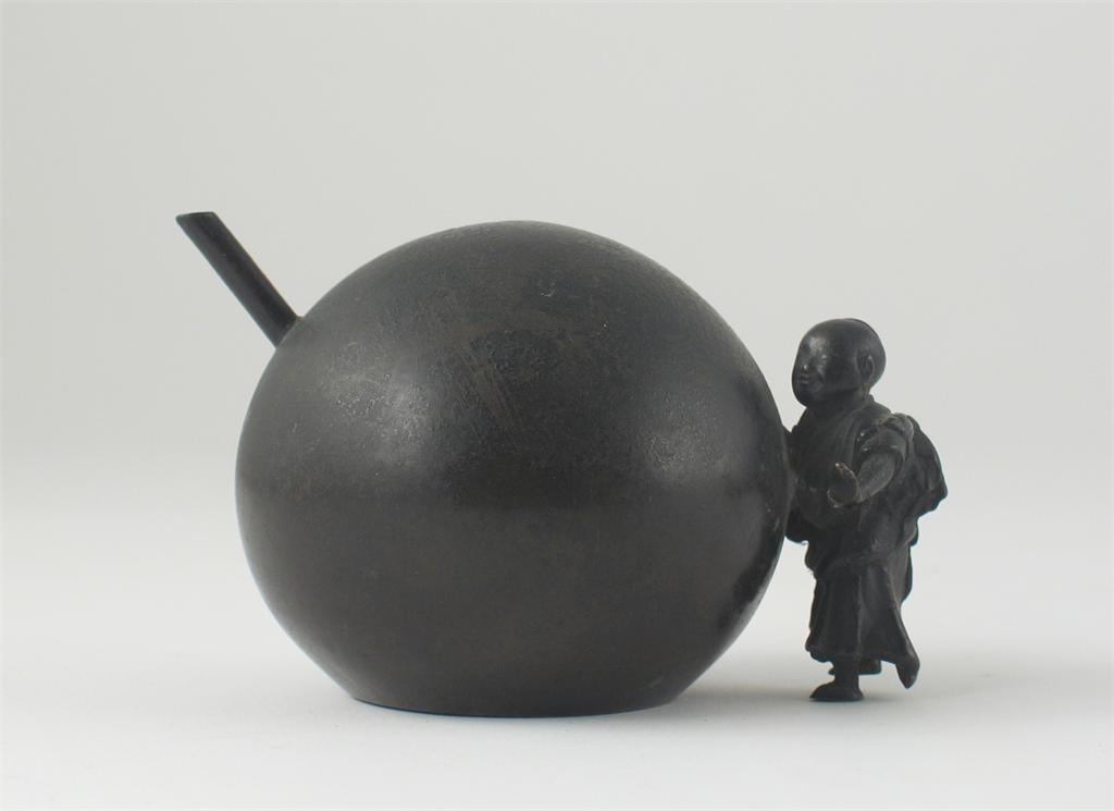 A Japanese bronze water dropper, cast as a little boy pushing a giant ball, 19th century, 7cm.
