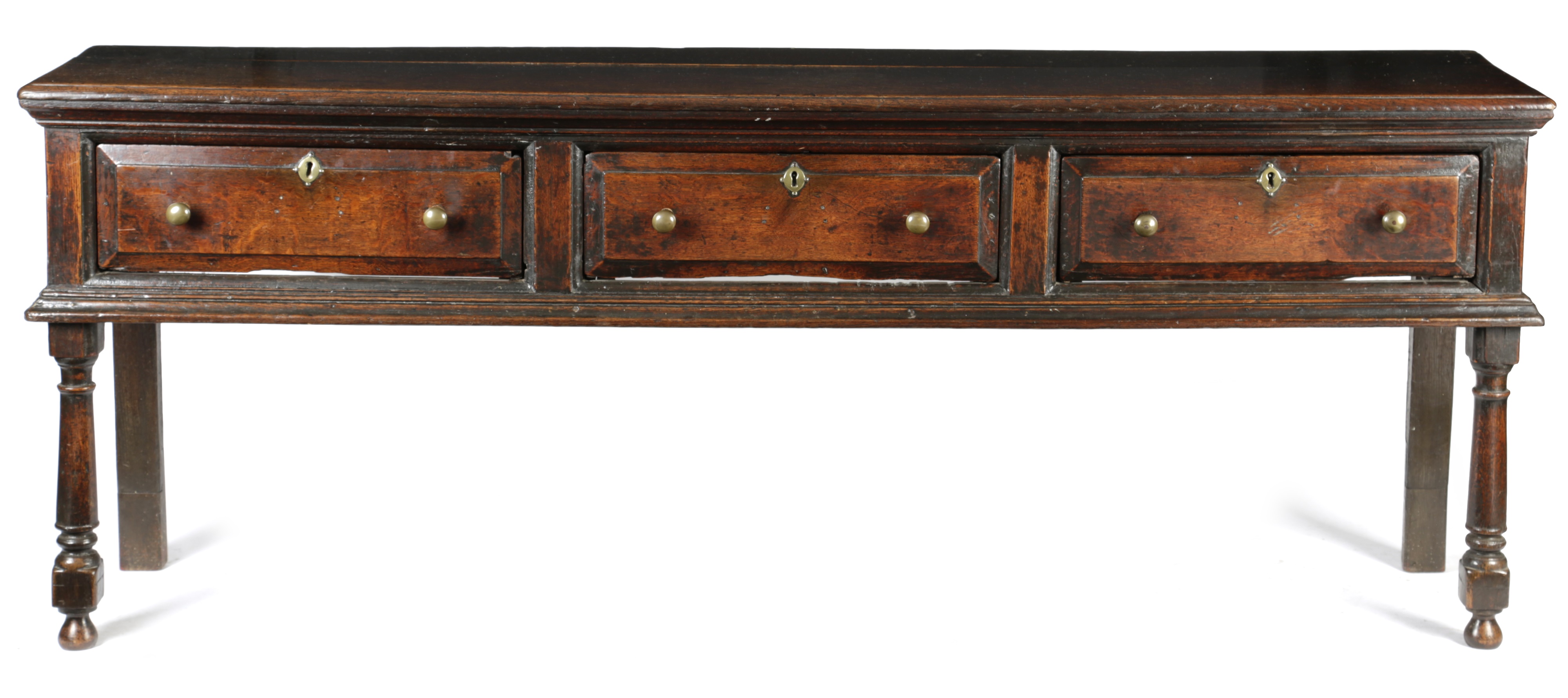 the boarded top above three fielded frieze drawers on turned and block front legs