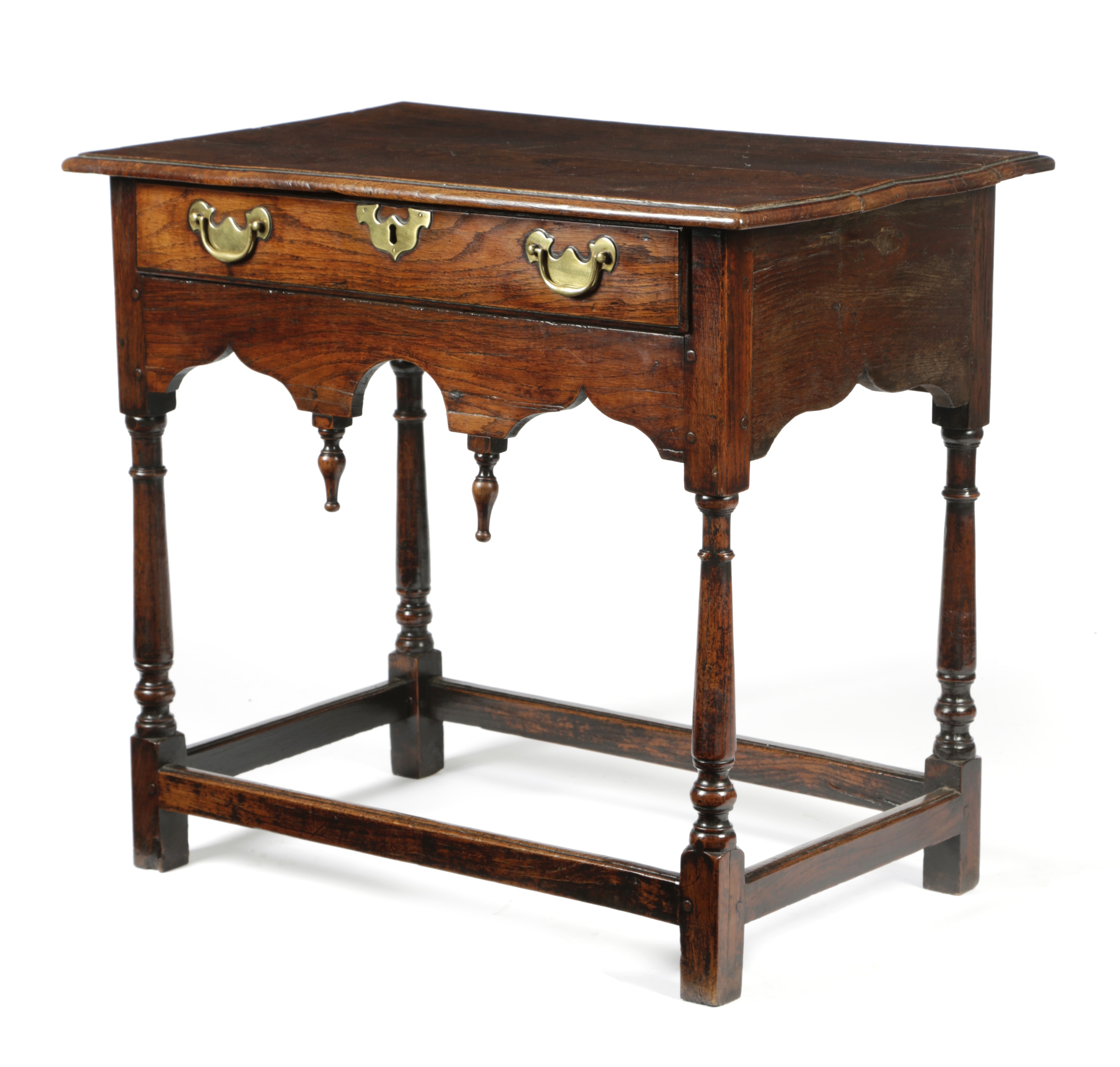 the boarded top above a frieze drawer and an archer's bow apron with turned pendants on baluster legs united by peripheral stretchers