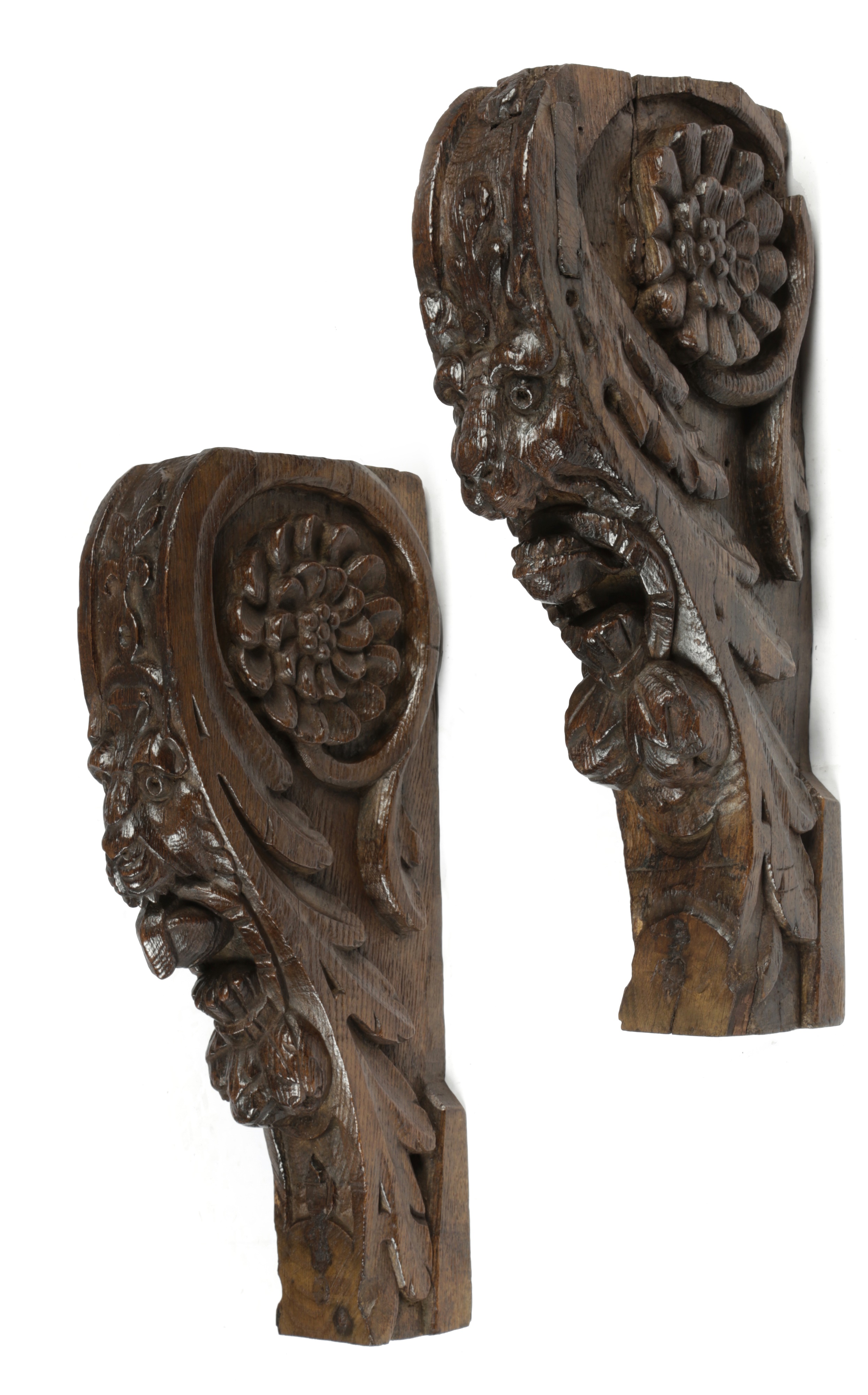 A PAIR OF CARVED OAK LION'S MASK CORBELS