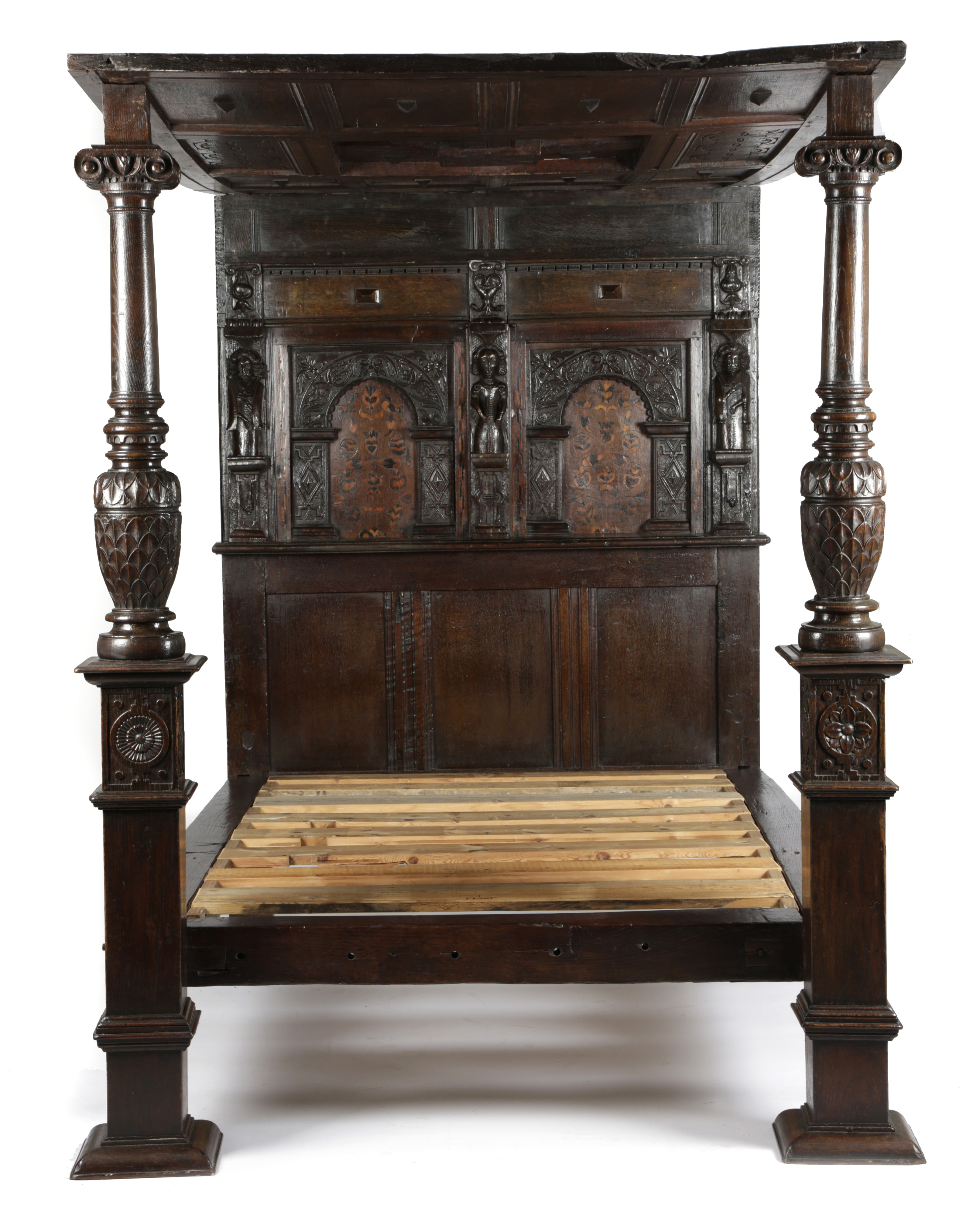the headboard with a pair of arched foliate carved panels inlaid with bog oak and holly marquetry flanked by caryatid figures, the central figure concealing a secret compartment with shelves, the panelled tester supported by leaf carved column supports with Ionic capitals