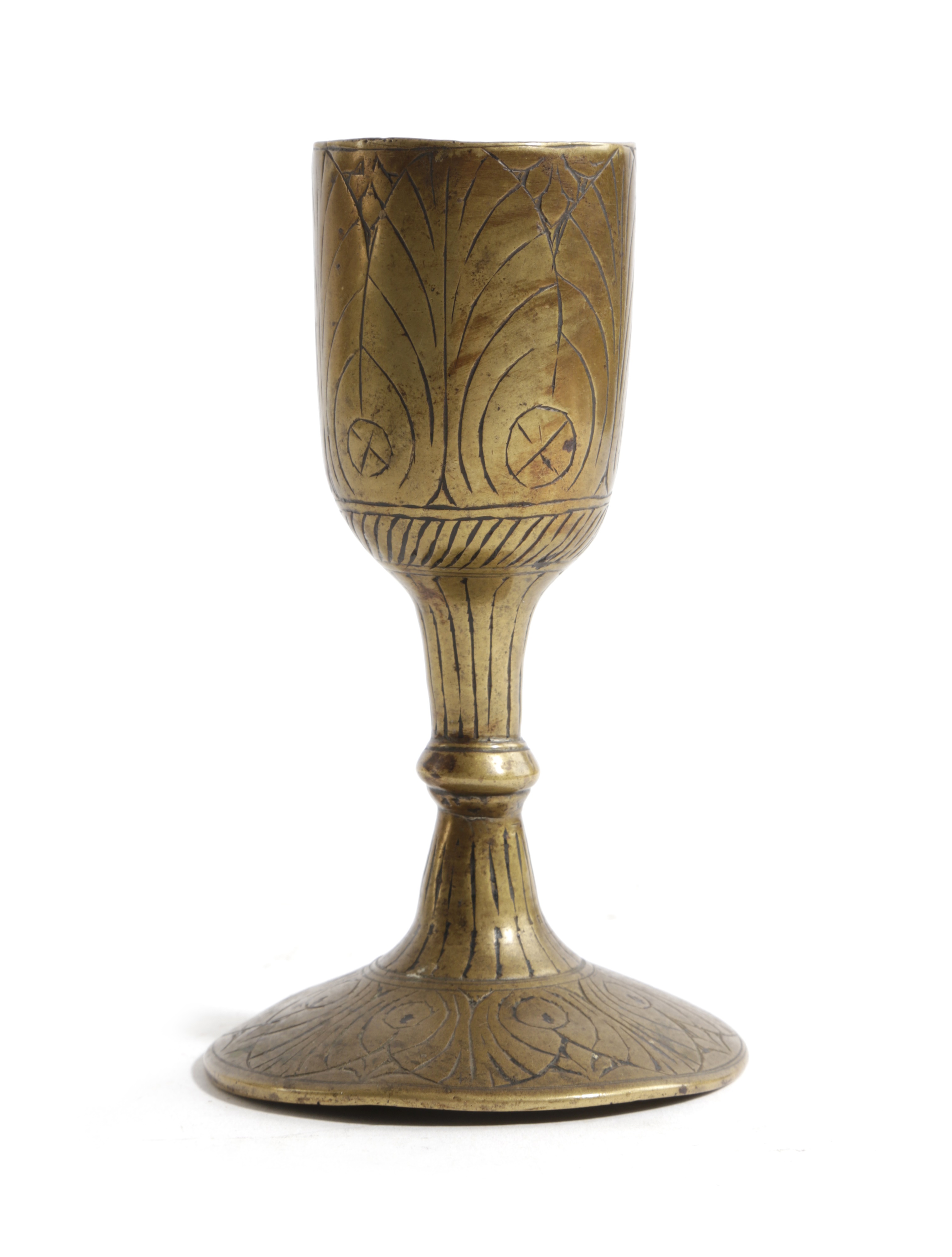 with engraved leaf decoration to the bowl above a knopped stem and a slightly domed foot with conforming decoration