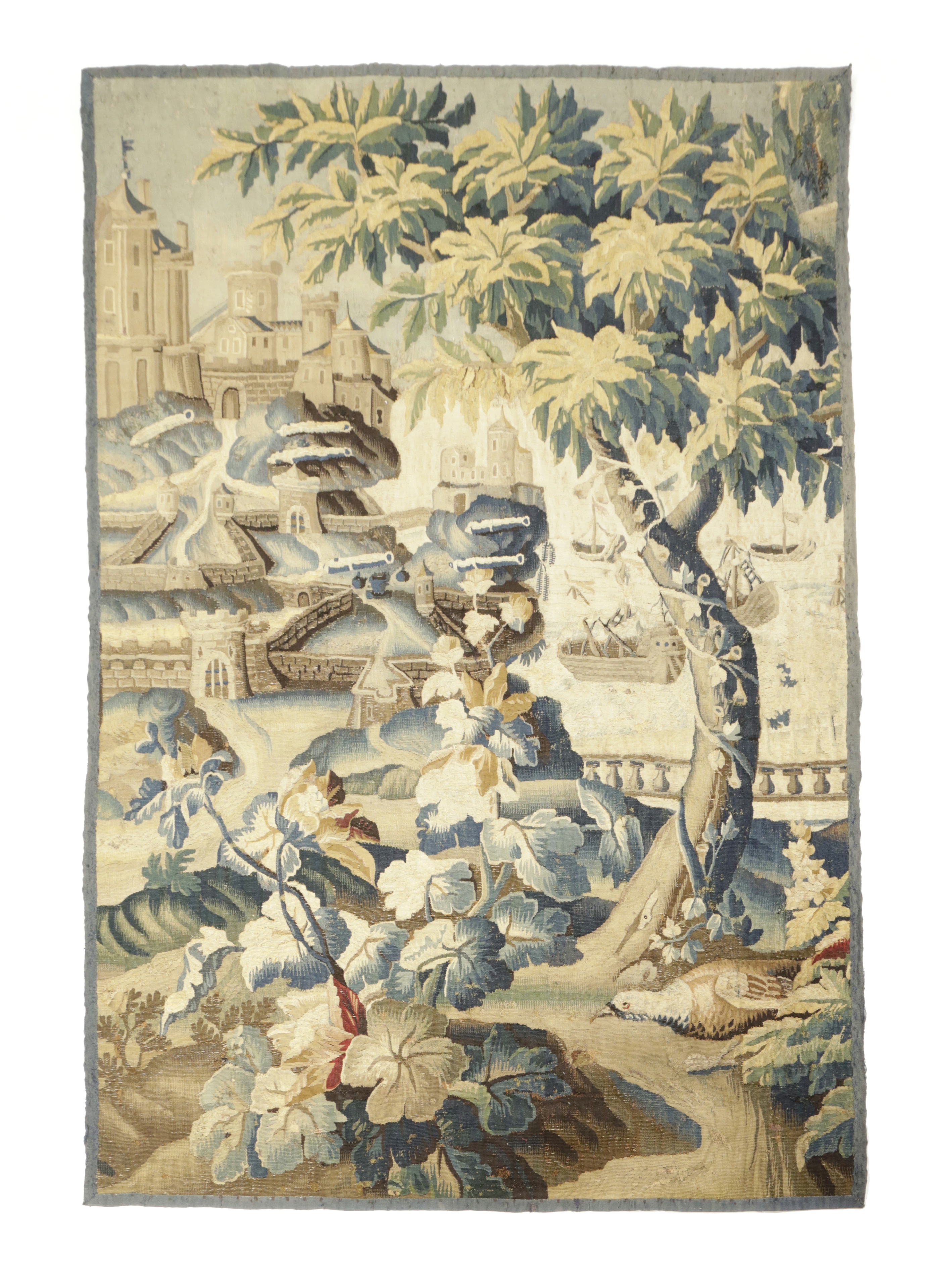 worked in wools and silk, depicting a coastal castle with trees, plants and a bird in the foreground