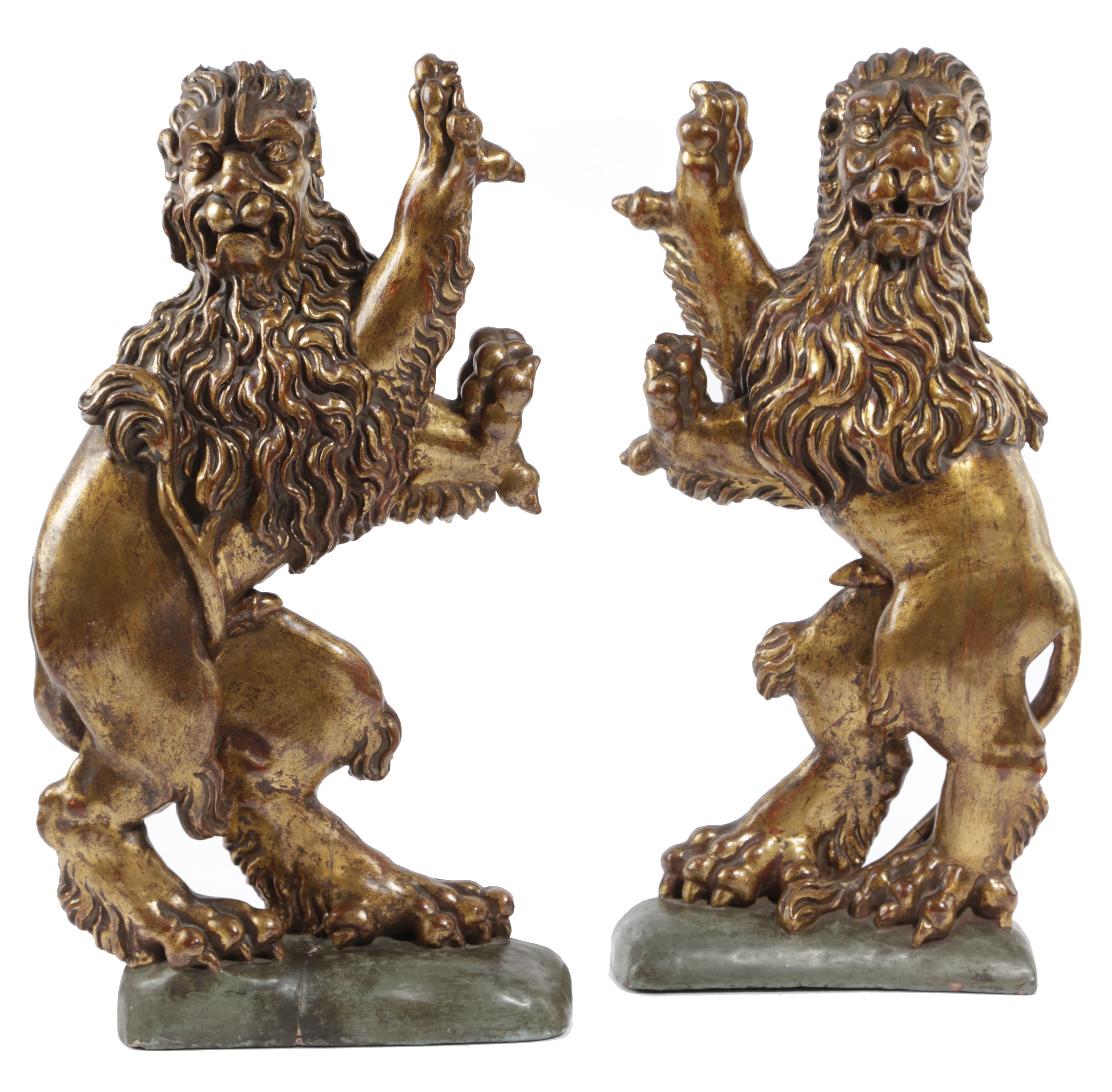 A PAIR OF GILTWOOD AND PAINTED RAMPANT LIONS