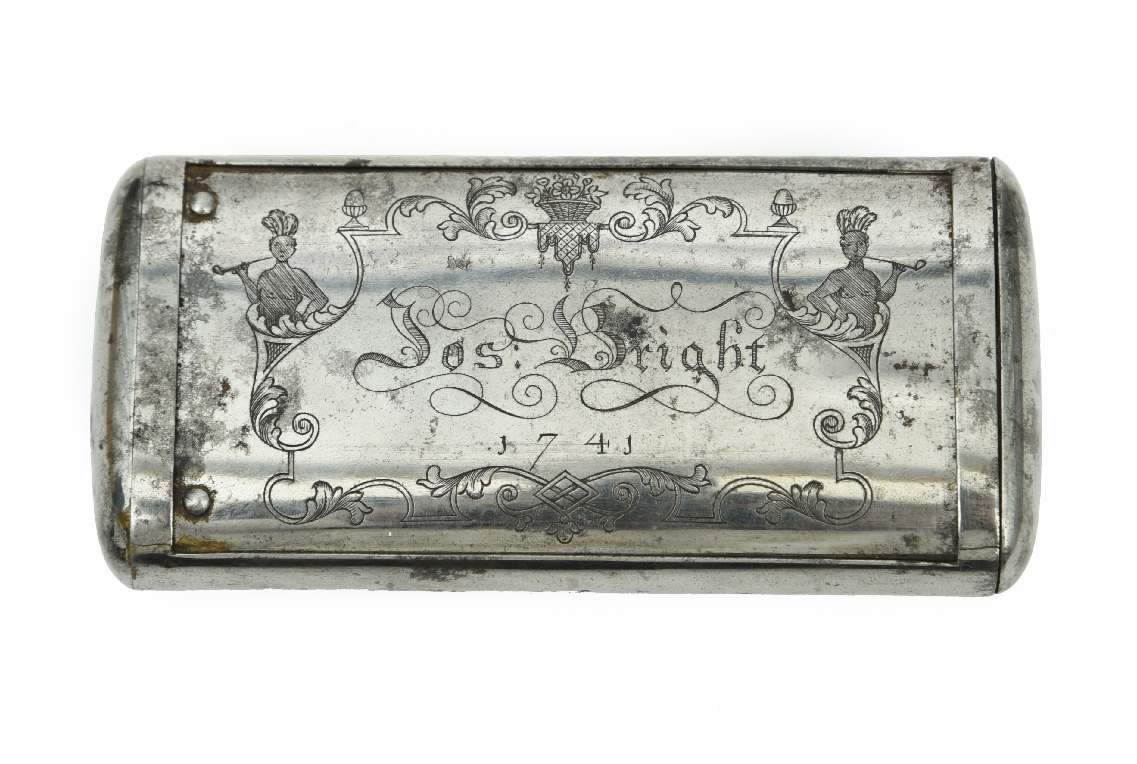 the sliding case with a pierced back and red painted interior, the top engraved with a leaf and strap cartouche, with a basket of flowers, urns and a pair of busts representing Native Americans smoking pipes, and 'Jos: Bright 1741' the edge stamped 'T.SHAW'