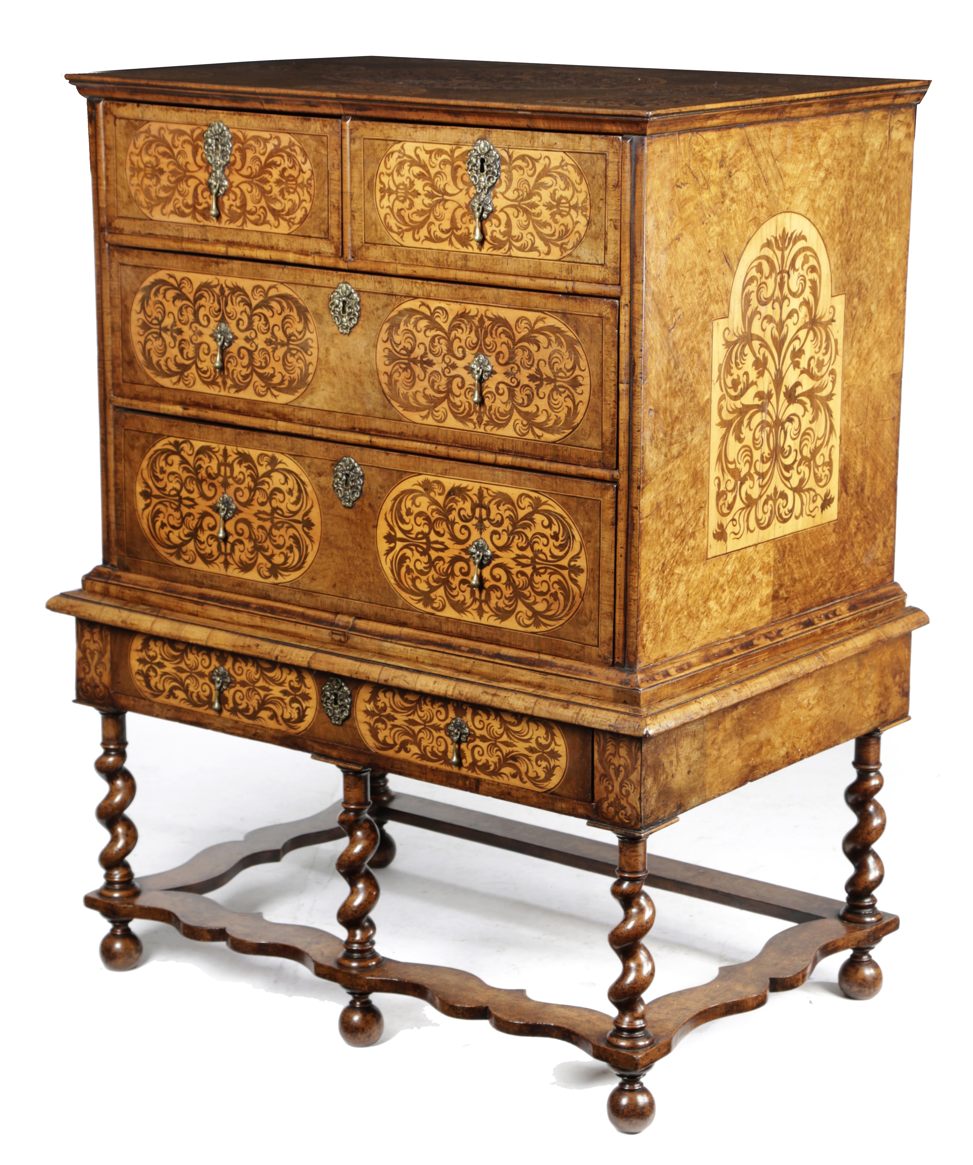A WILLIAM AND MARY WALNUT AND MARQUETRY CHEST ON STAND