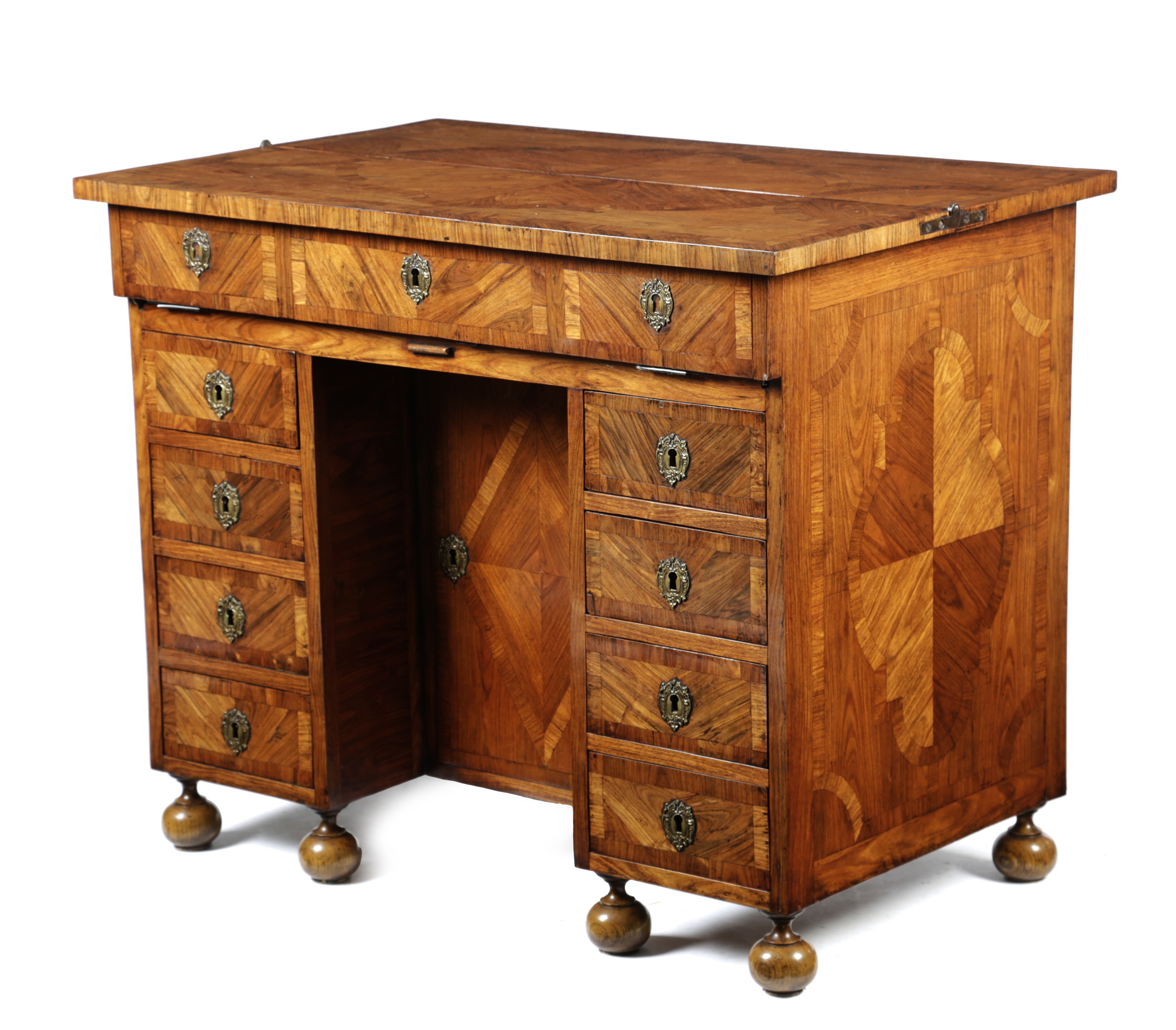the quarter veneered top with banding, hinged to reveal four drawers and with a fall front above eight further drawers around a central cupboard