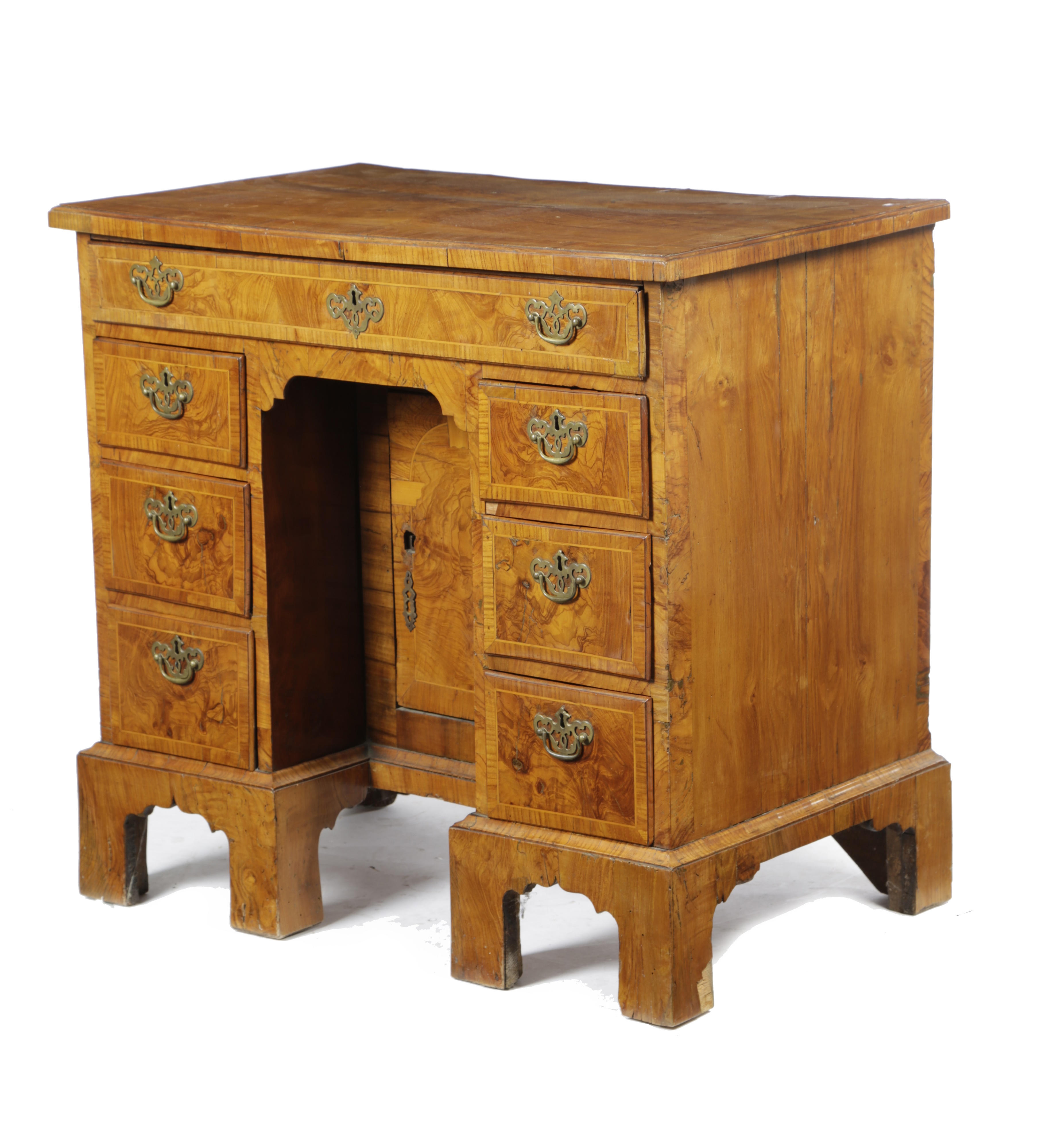 the quarter veneered and crossbanded top above an arrangement of seven drawers around a central cupboard, on archer's bow bracket feet