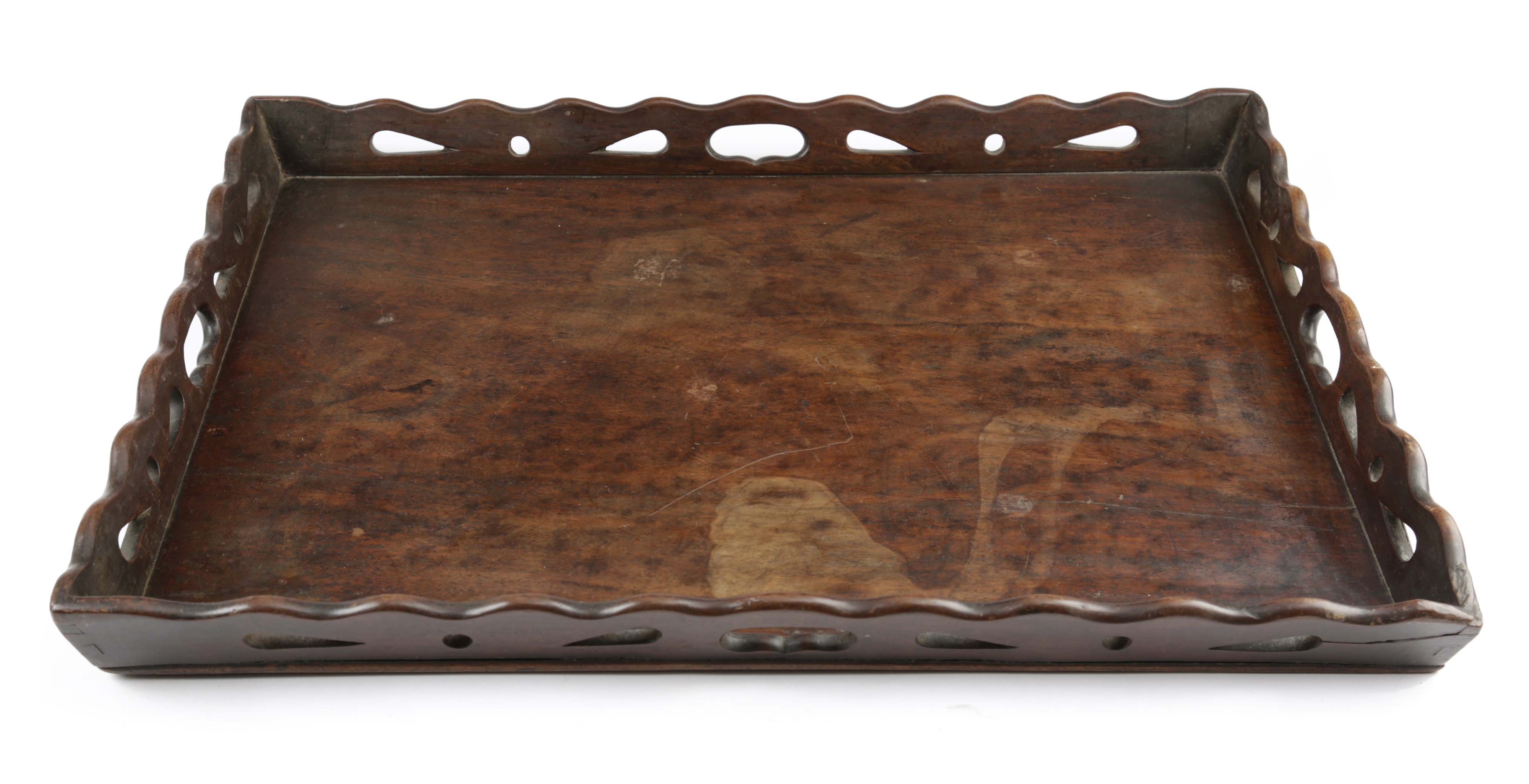 the wavy edged gallery with pierced decoration and four handgrips, with a plum pudding centre