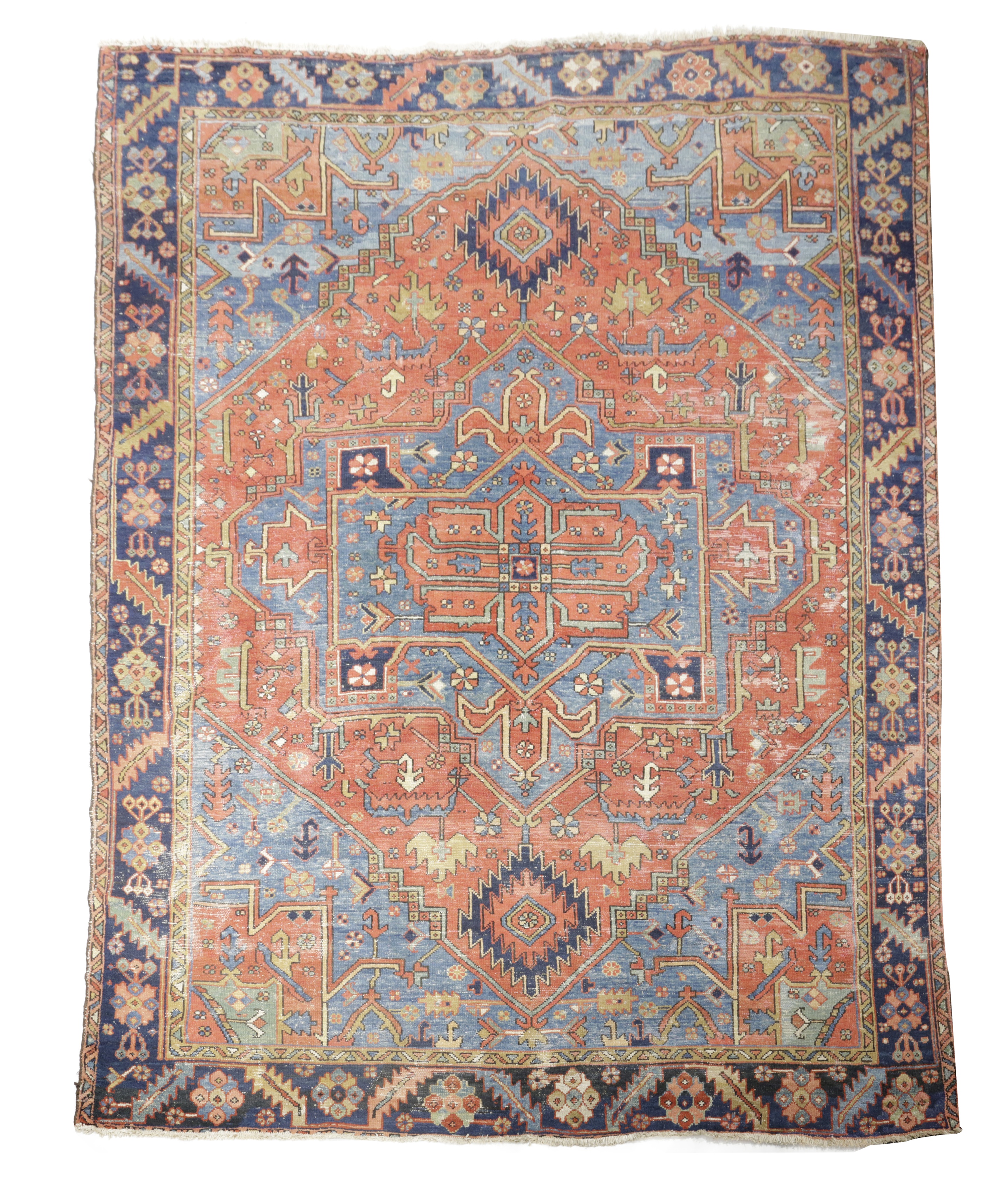 the terracotta field of angular vines, centred by sky blue medallion, enclosed by spandrels and indigo borders of polychrome flowerheads and serrated leaves, flanked by guard stripes