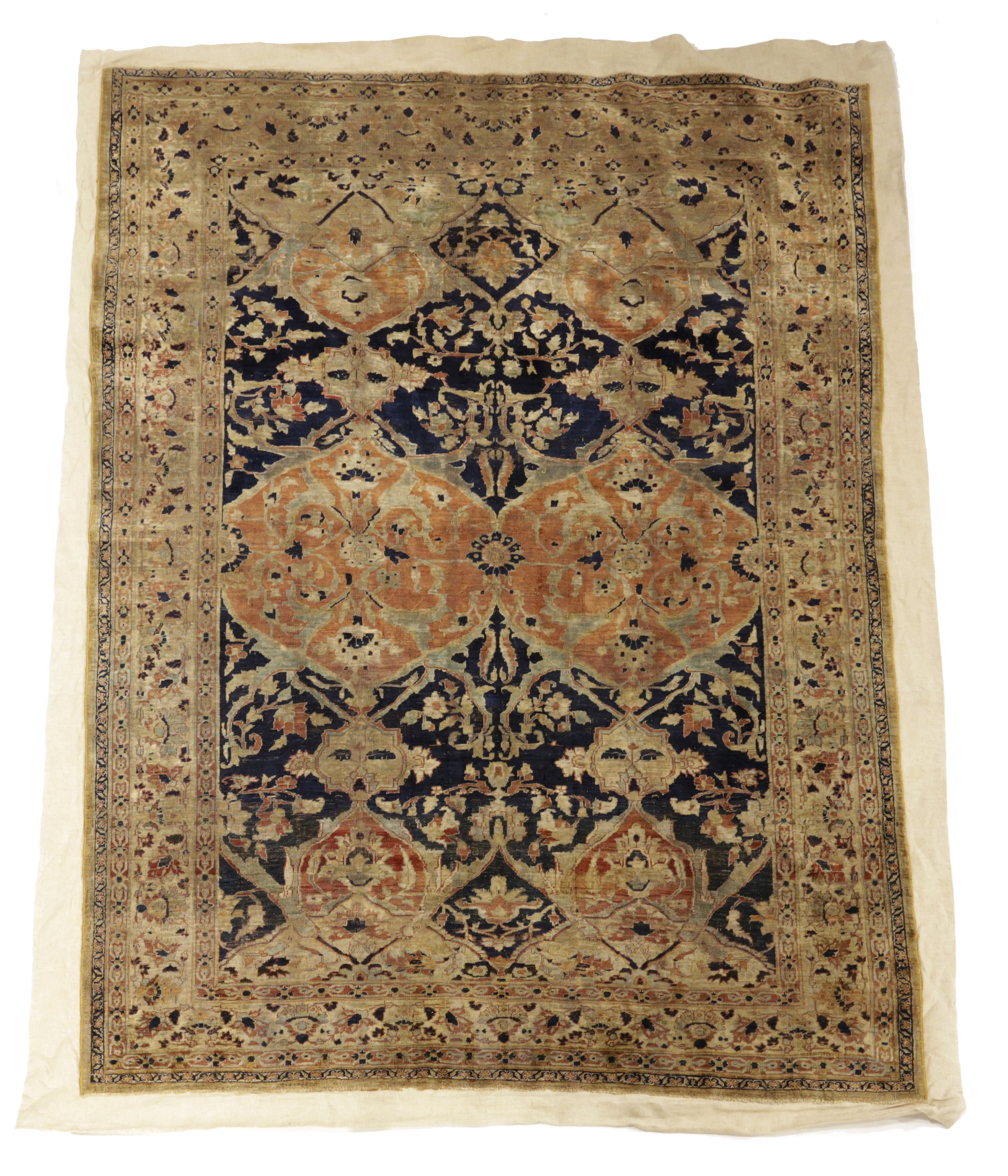 the deep indigo field with two terracotta panels, surrounded by vines and further panels, enclosed by borders of meandering vines and outer carnation guard stripes, now mounted on linen / cotton