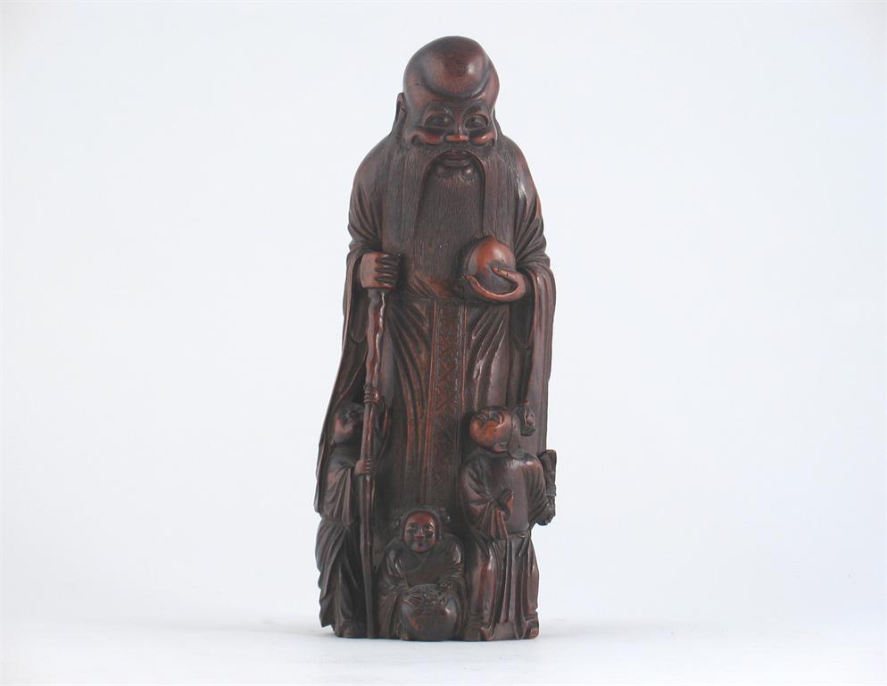 A Chinese bamboo carving of Shoulao, standing holding a peach with three attendants at his feet, 19th/20th century, 29.5cm.
