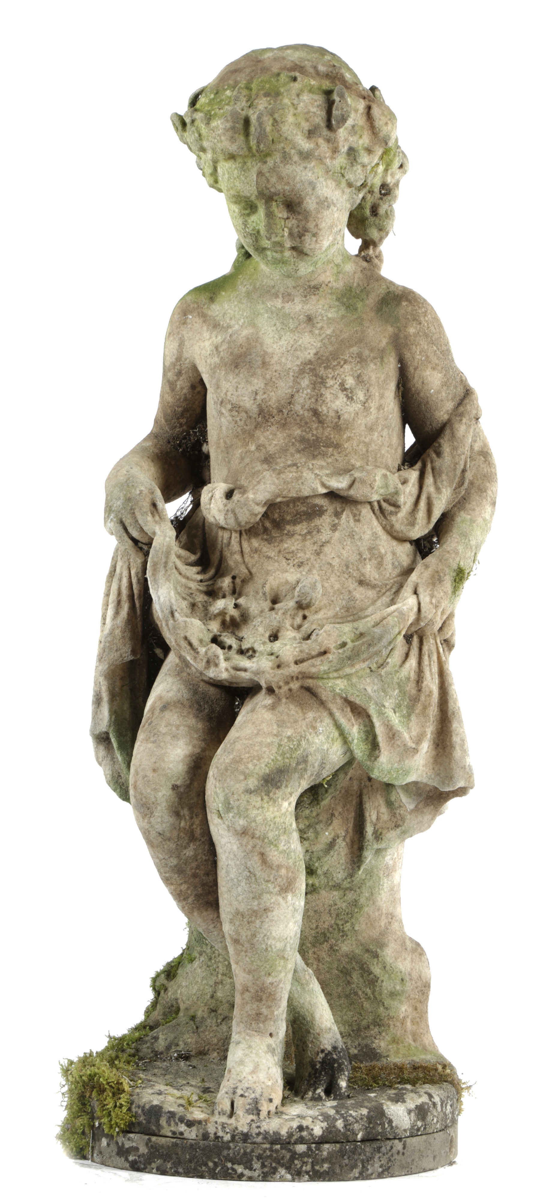 with flowers in her hair and wearing a falling garment used to carry flowers and sitting on a tree stump, the circular base with a bronze acorn shaped plug / handle to rotate on the circular pedestal, with relief florets to the frieze (2)