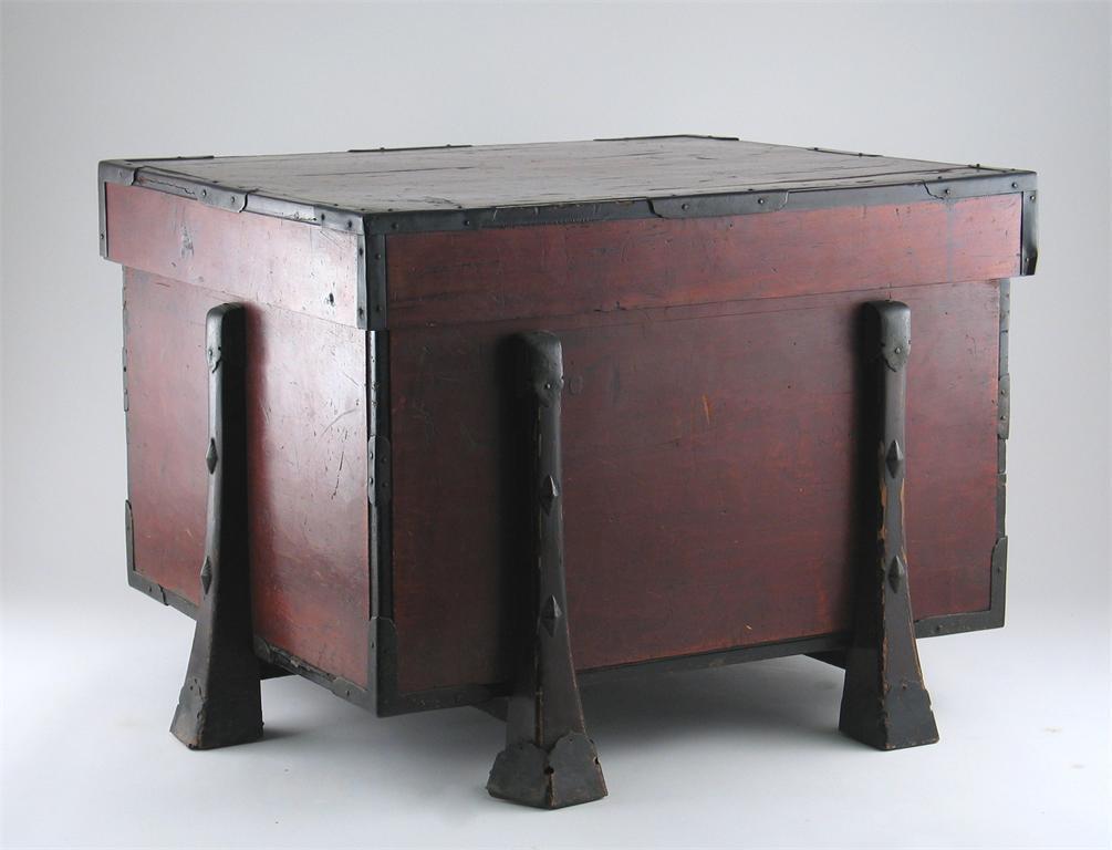 A Japanese rectangular box and cover, raised on six splayed feet, one side with calligraphy. Some damage. 19th/20th century, 61cm. (2)