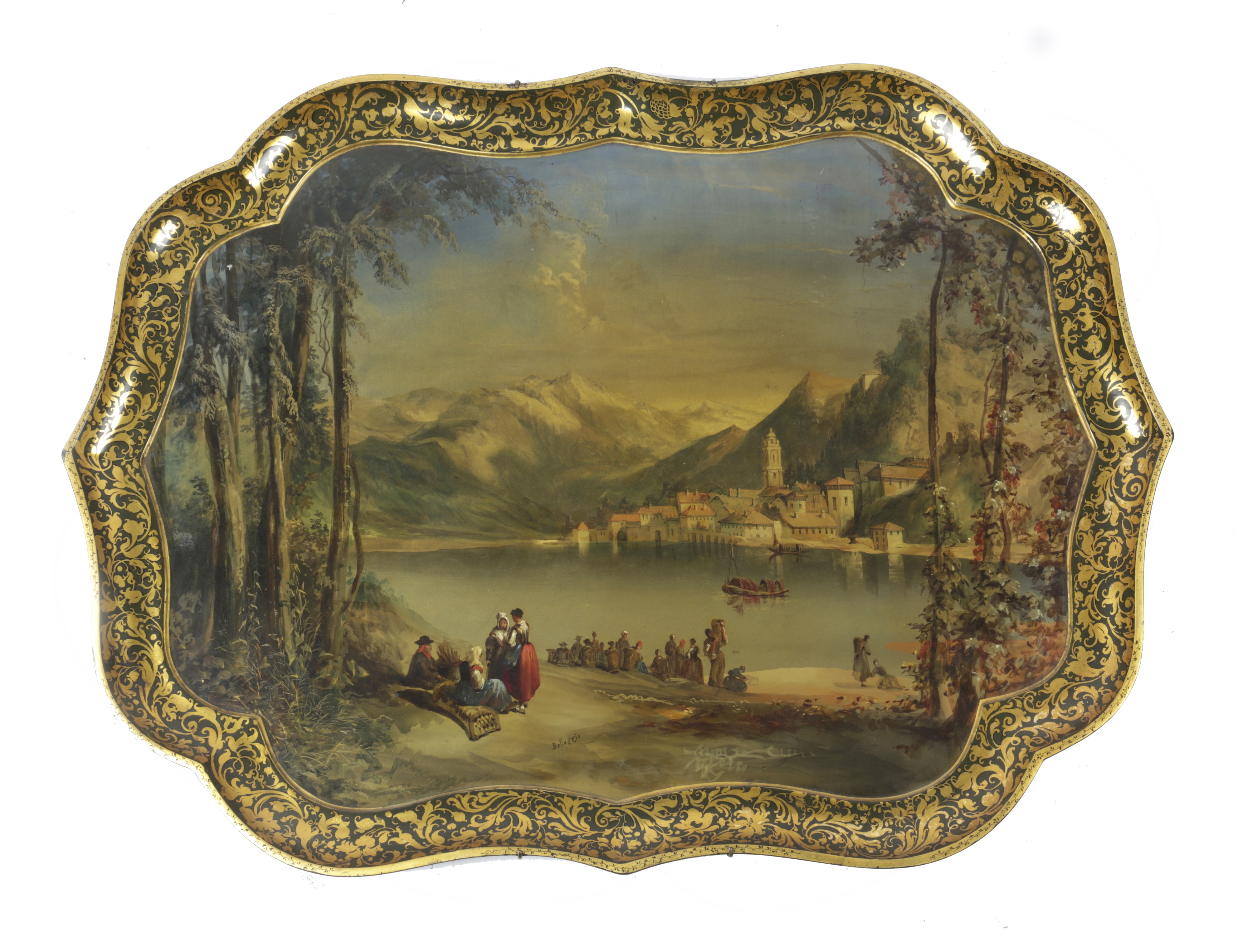 the centre well painted with an Italianate lake scene with figures and mountains beyond, signed 'Bellaggio' within a gilt scrolling leaf border, the back with impressed marks 'Crown, Jennens & Bettridge Birmm & London'