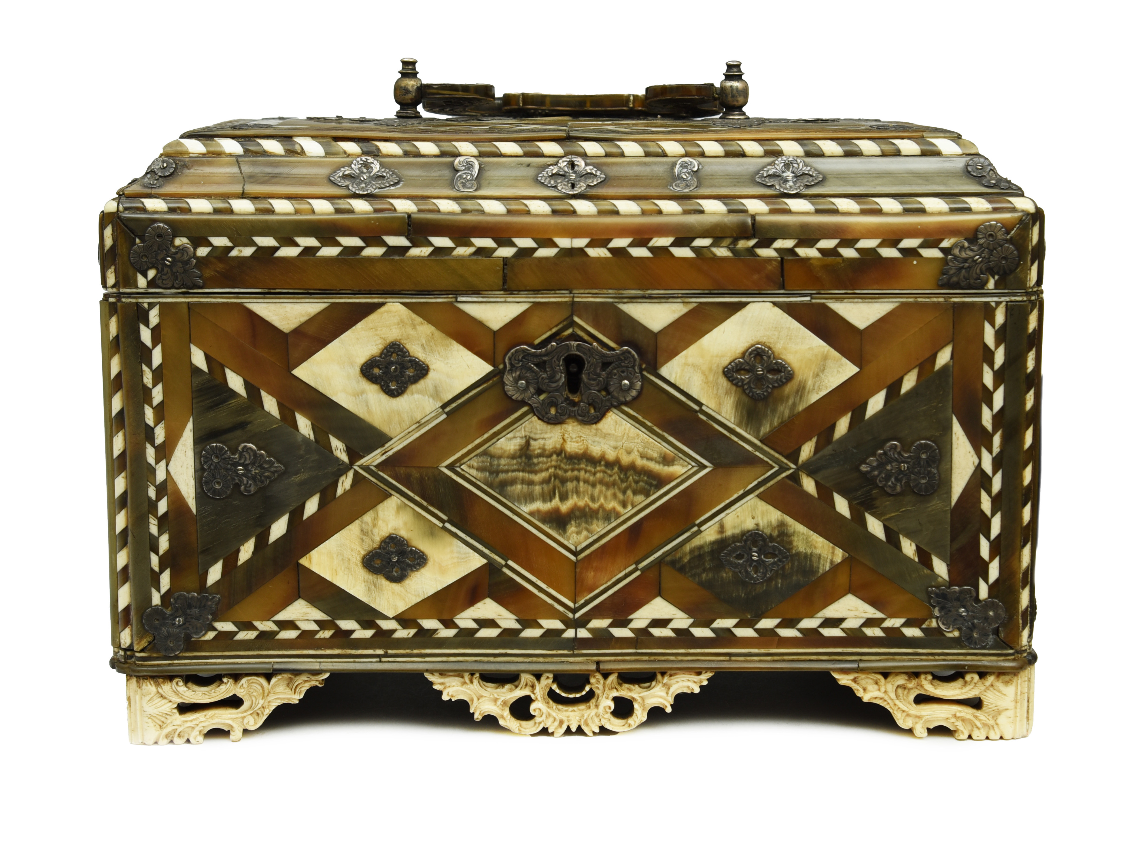 with parquetry and bone chevron decor, the hinged lid with a swing handle engraved with three birds, revealing an interior with three lidded divisions on pierced and carved bracket feet