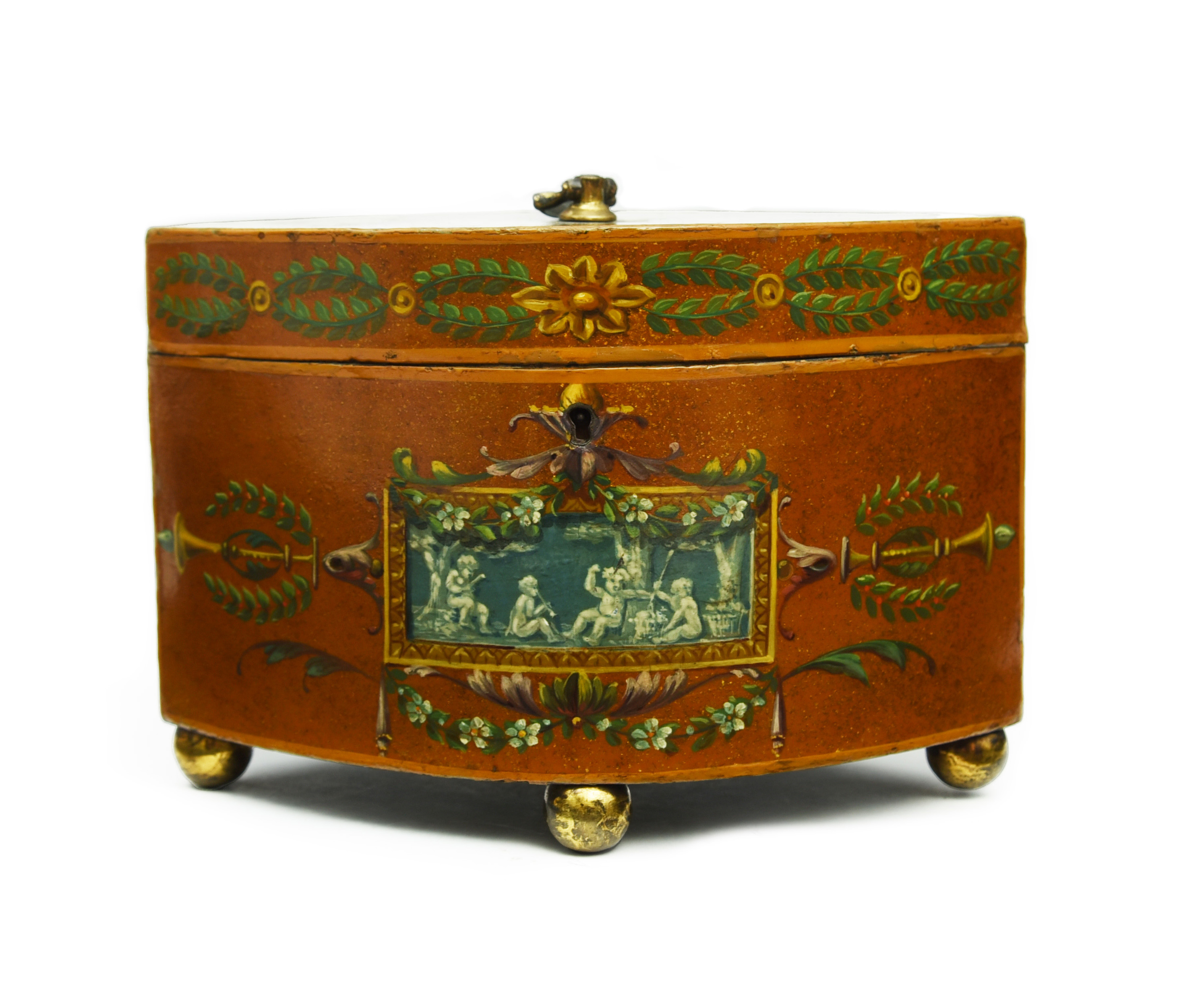 of navette form, the speckled gold ground painted with festoons of flowers, foliage and trophies with en grisaille panels of cavorting cherubs, with a twin lidded interior on brass ball feet