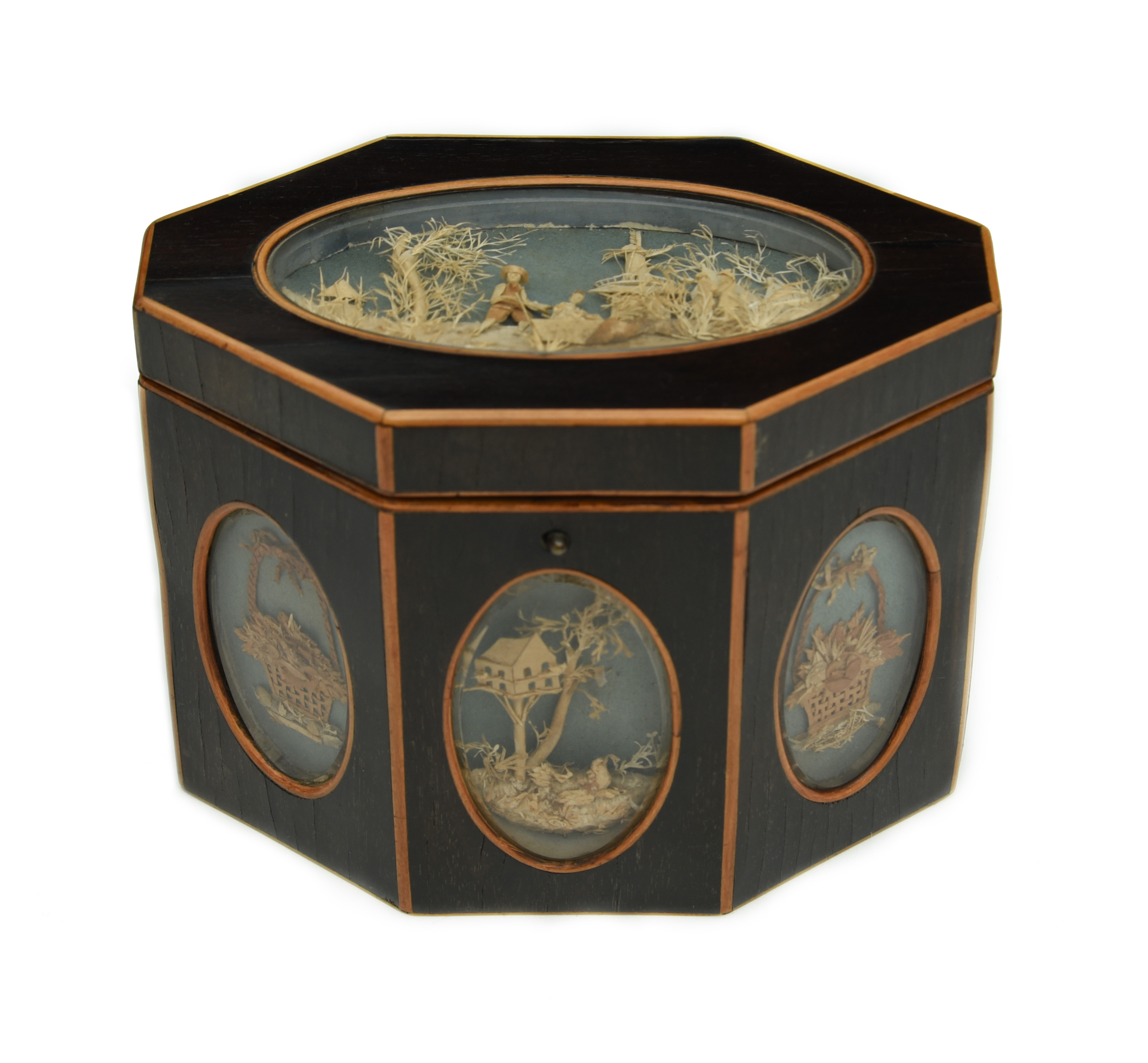 of octagonal form, the cover and sides inset with modelled paper cameos depicting trophies and rustic scenes, under glass, the reverse with bat's wing paterae