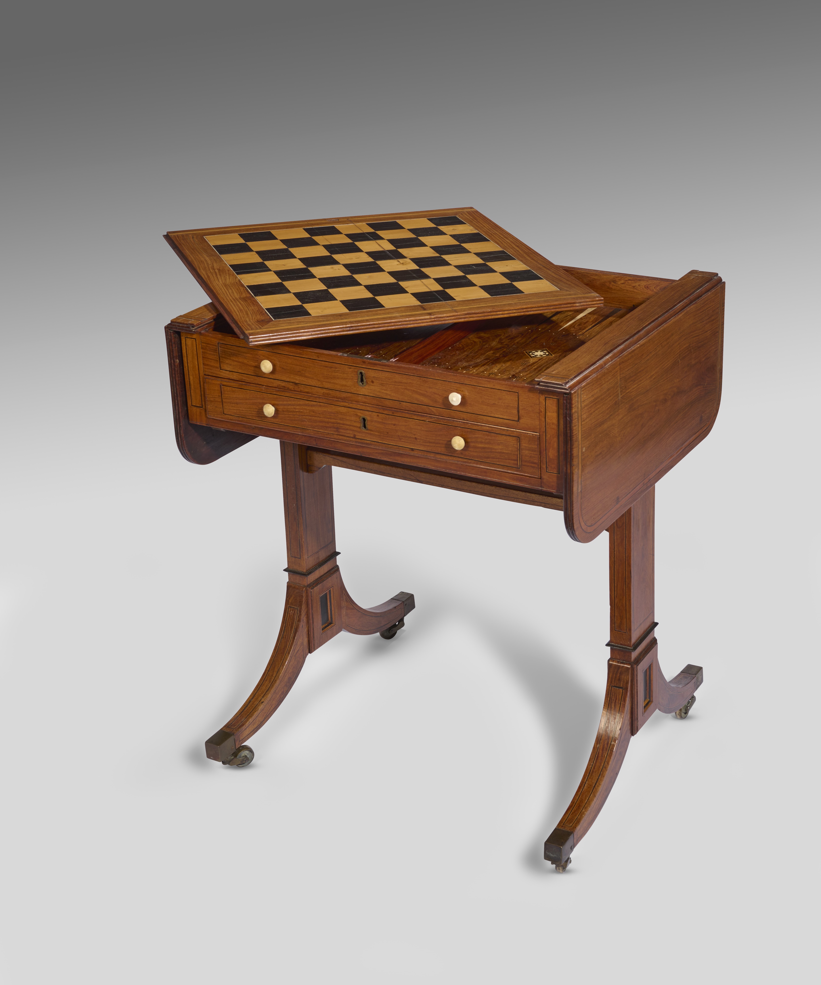 inlaid with stringing and banding, the drop-leaf top with a reeded edge, with a sliding reversible centre inlaid with an ebony and boxwood chequer board to the underside, revealing a backgammon board, inlaid with ebony and bone, with parquetry squares and lozenges, above a camphorwood double sided frieze drawer, with bone handles, on trestle ends and swept legs, terminating in brass castors