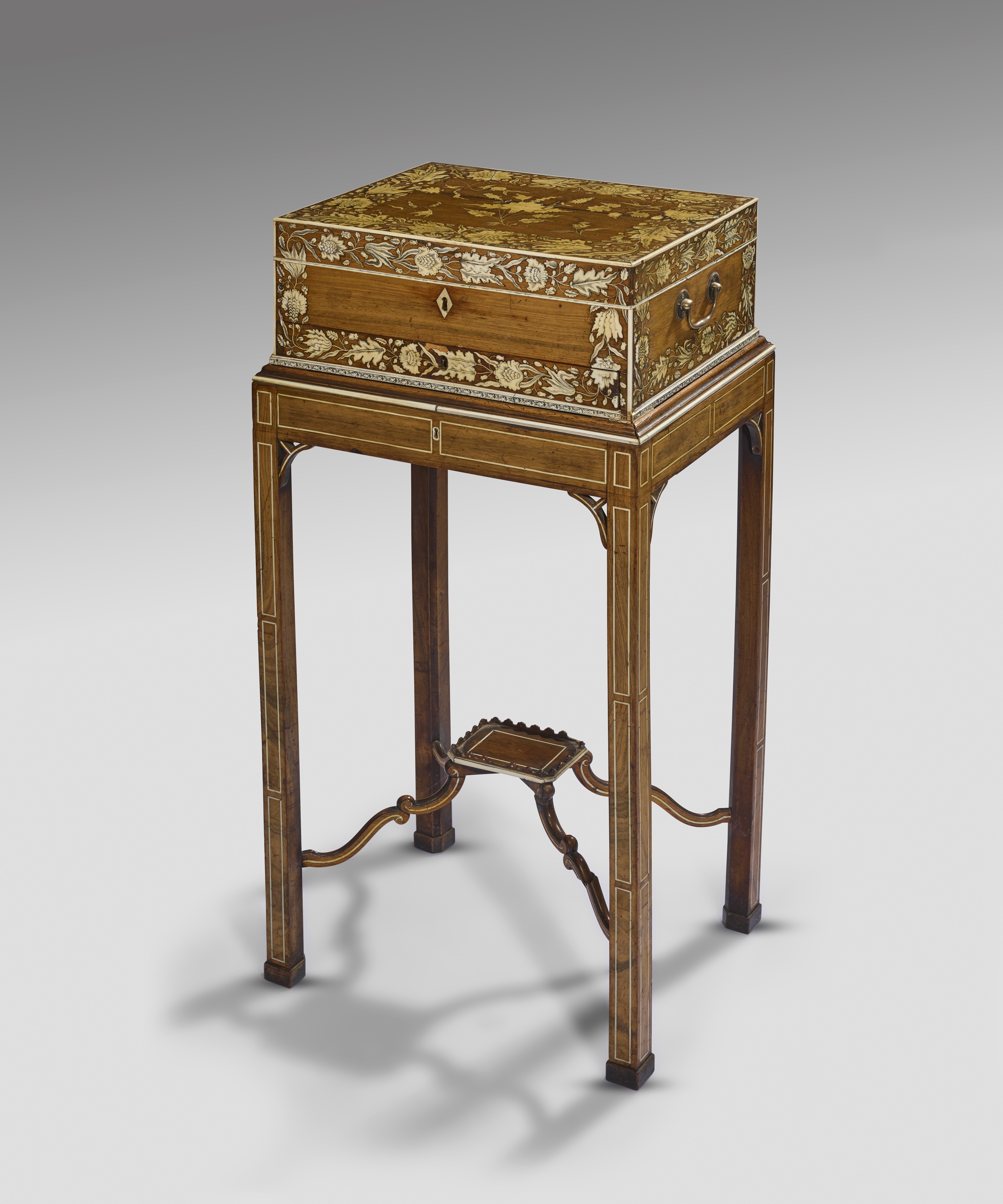 the box inlaid overall with bands of lac decorated with flowers and leaves, the hinged lid revealing a fitted interior with four lidded compartments, open divisions and a central pink silk lined pin cushion with hinged cover, revealing three long divisions, with silver side carrying handles, above a base drawer, on a Chippendale style stand, inlaid with ivory stringing