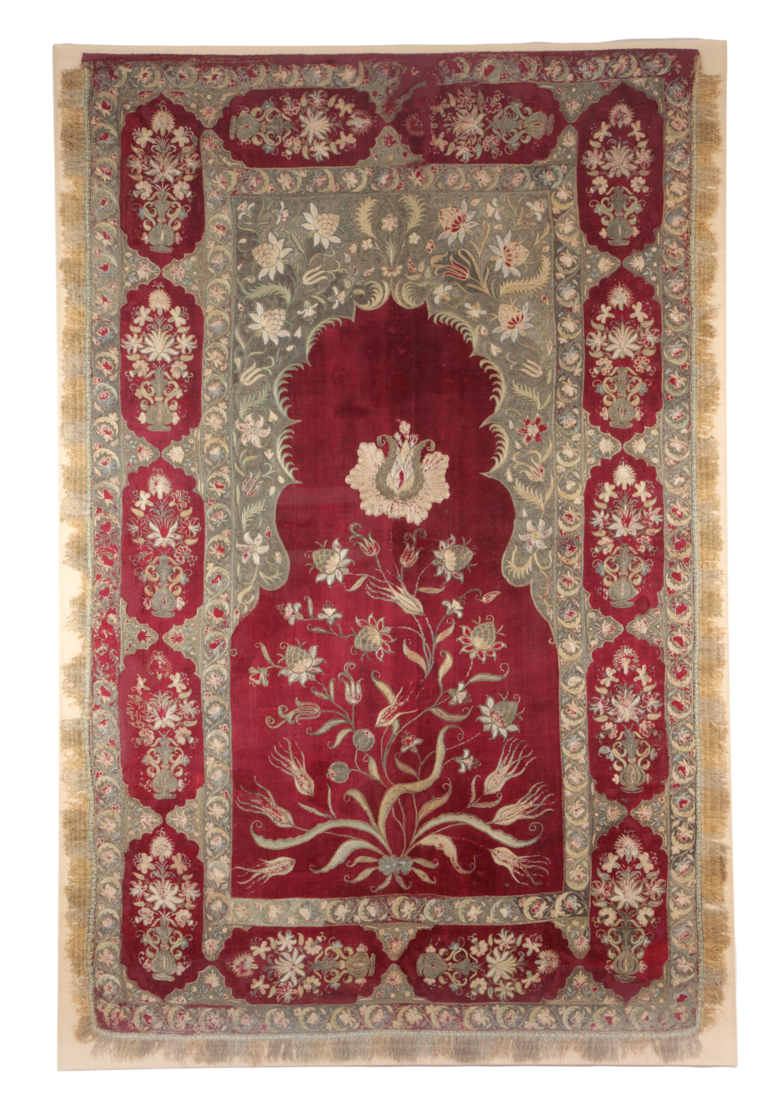 the Kashmir wool ground worked with gold and silver thread embroidery, the raspberry field with a flowering plant issuing tulips and further flowers, beneath a leafy cusped Mihrab, the upper spandrels with further floral decoration, enclosed by borders of urns and flowers, flanked by meandering vine guard stripes, later mounted on a linen board in an acrylic frame
