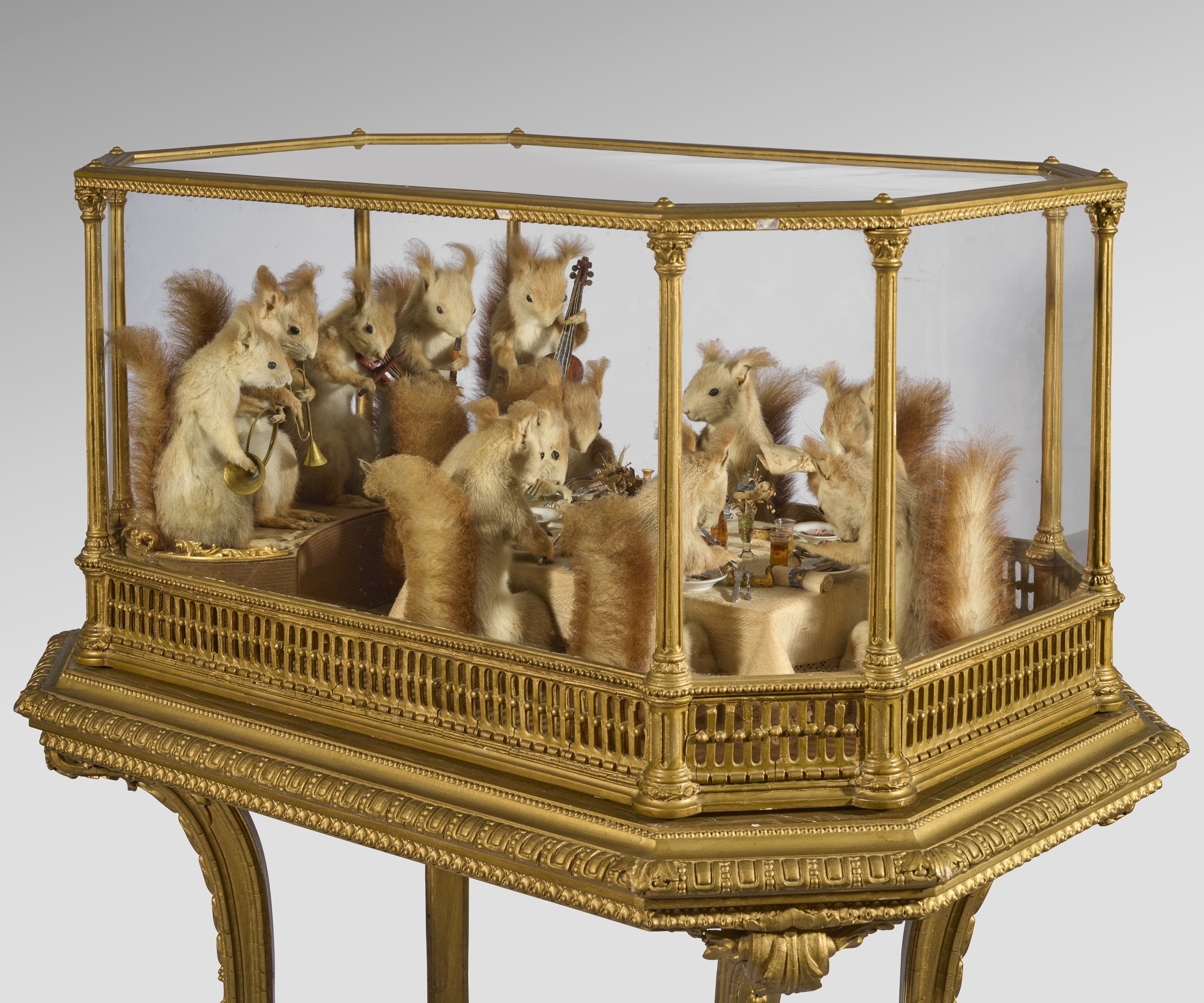 the anthropomorphic tableau depicting twelve red squirrels, seven seated around a table eating and drinking, with miniature items of cutlery, glassware and crockery one squirrel wiping his mouth with a napkin with initials 'E J M' and five as a band playing musical instruments including a cello, violin and a French horn, in a glazed giltwood and composition display case on stand