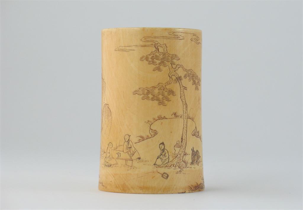 A Chinese ivory cylindrical brushpot, engraved with figures and animals at leisure in a landscape beneath pine and willow, 19th century, 9.5cm.