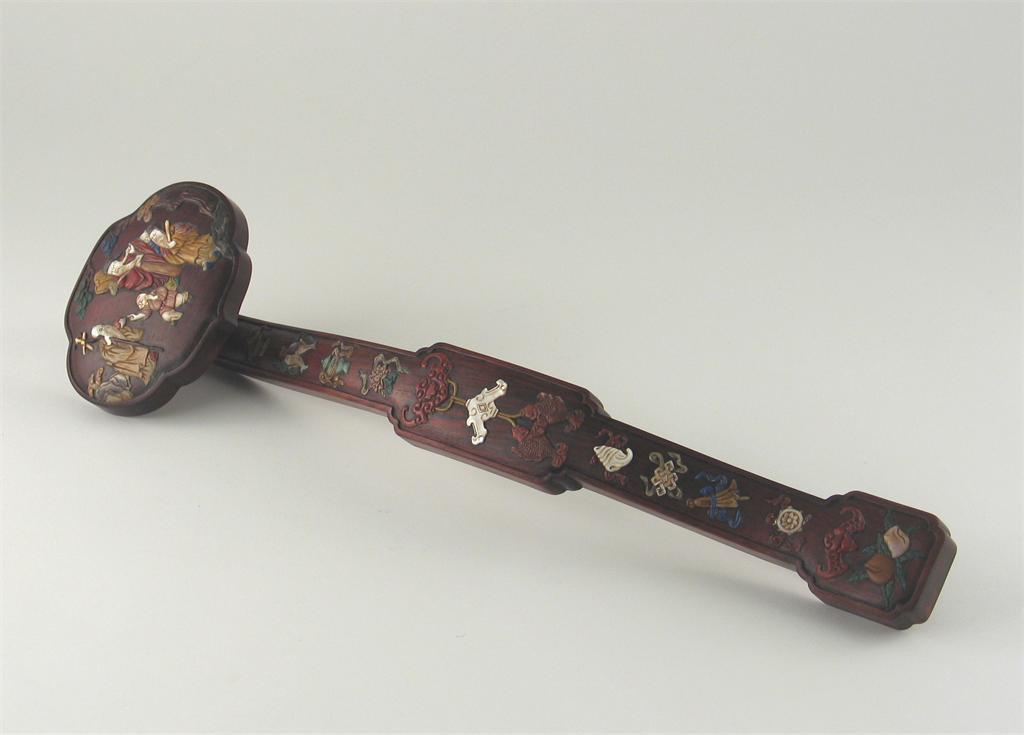 A Chinese hardwood sceptre, inset in mother of pearl and coloured stone with figures, trees and the bagixiang (the Eight Buddhist emblems), 46.5cm.