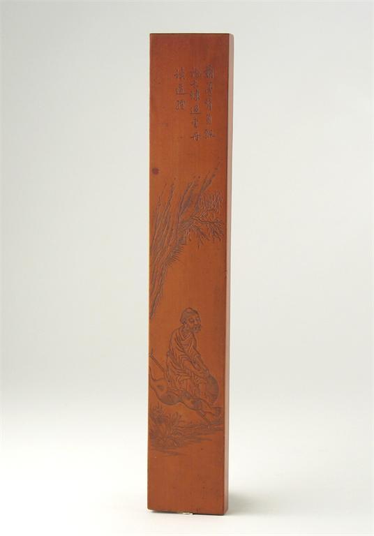 A Chinese boxwood scroll weight, carved with a watery landscape beneath calligraphy on one side, the other with an immortal beneath calligraphy, 19th century, 30.5cm.