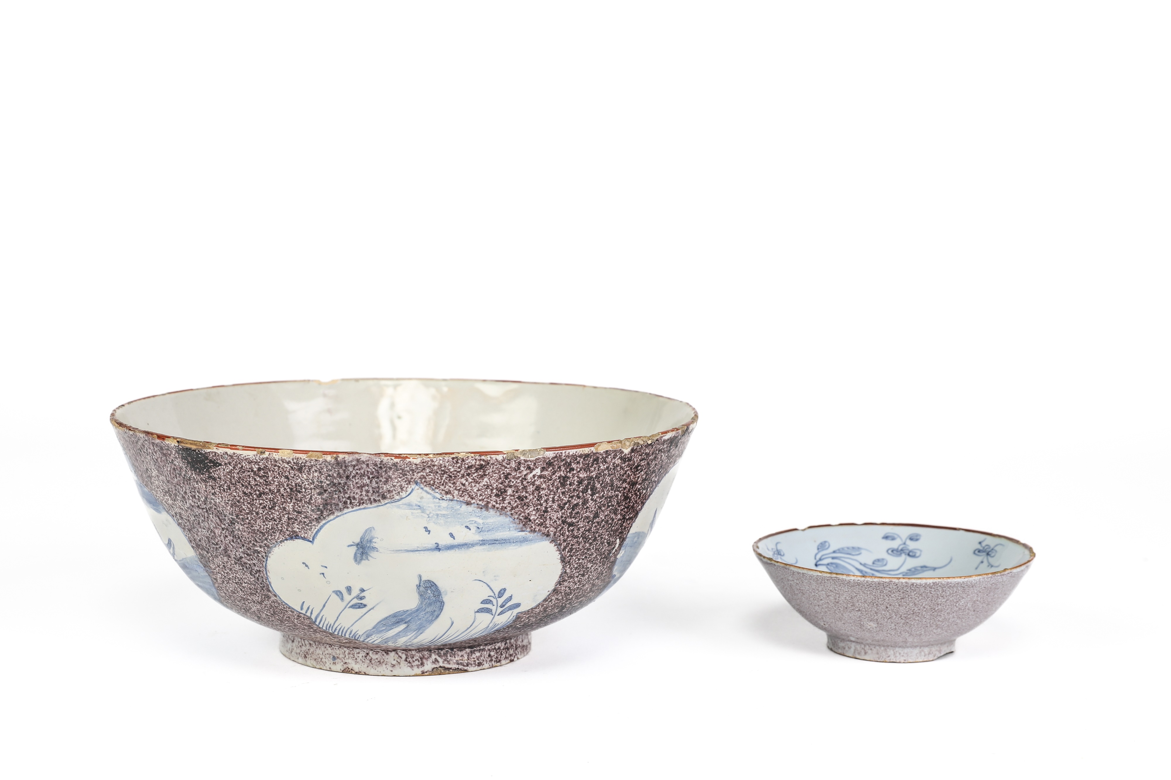 the interior with a four line rhyme in support of King George, the exterior with blue painted ogee panels on a powdered manganese ground, together with a small bowl, the interior with line drawn foliage, the exterior with a powdered manganese ground (2)