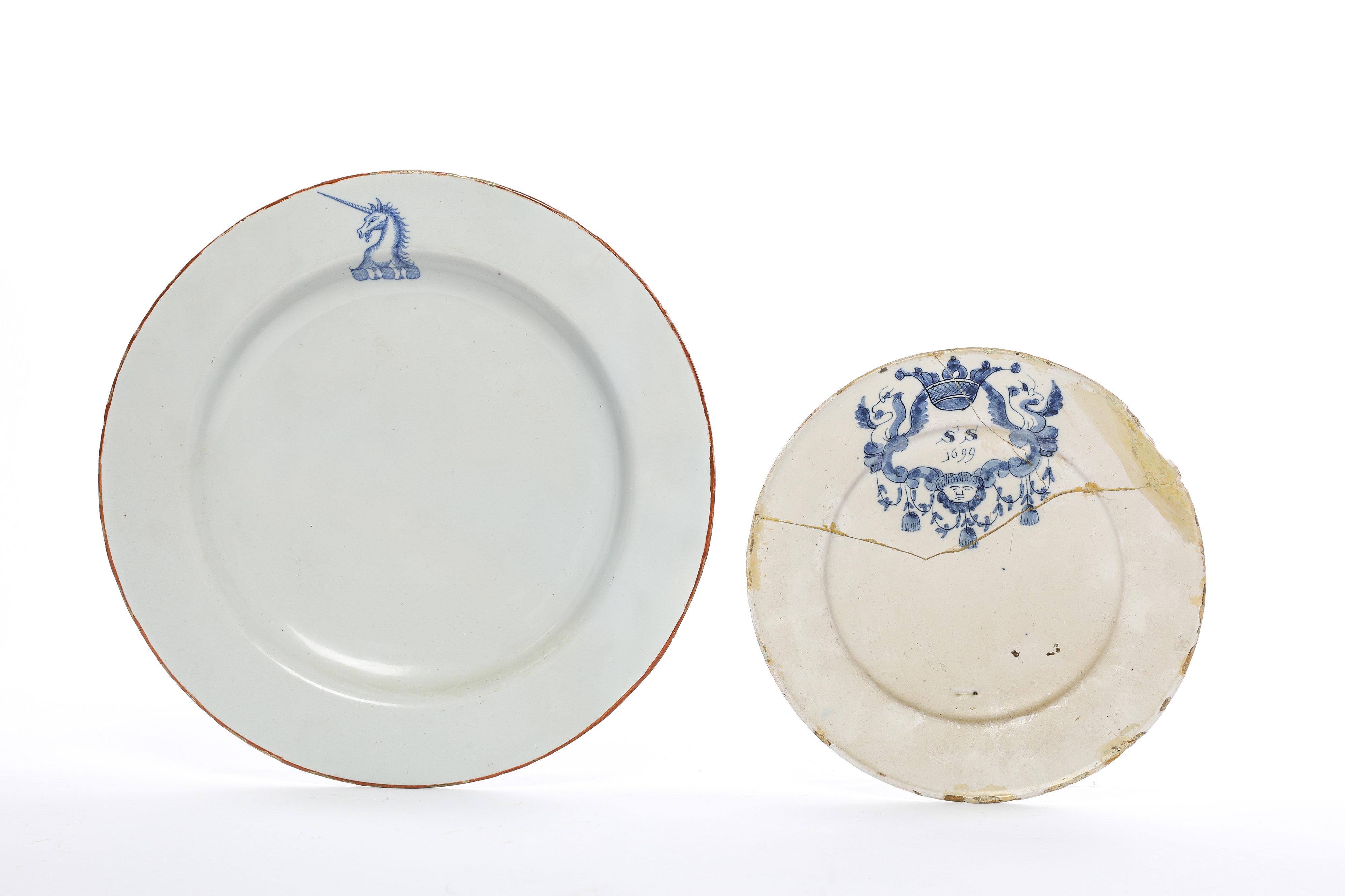 blue painted with a unicorn crest inside an ochre border, together with a crested plate, dated '1699', painted with the initials 'SS' above '1699', flanked by winged beasts and beneath a crown (2)