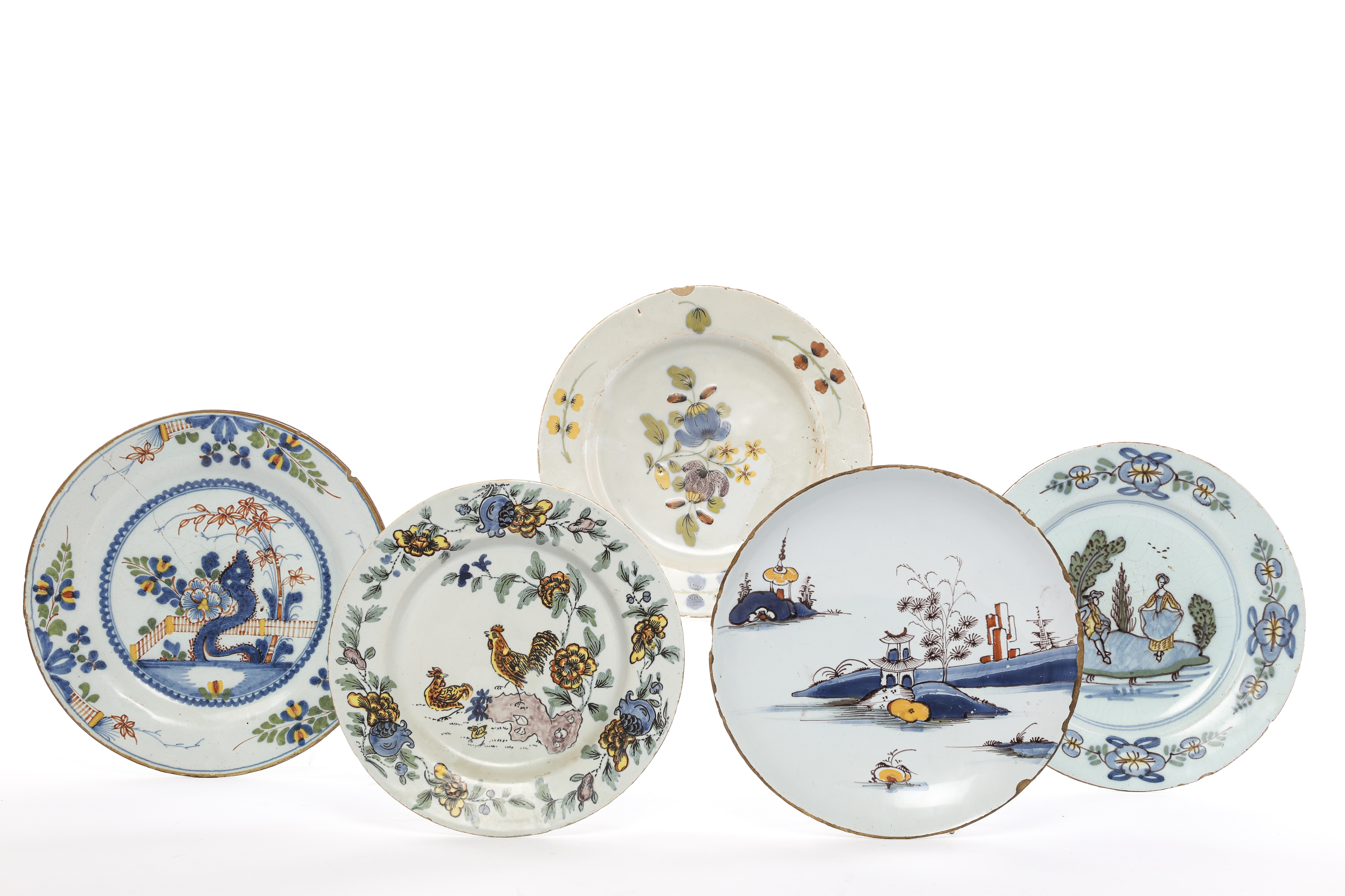 A COLLECTION OF FIVE DELFTWARE POLYCHROME DECORATED PLATES