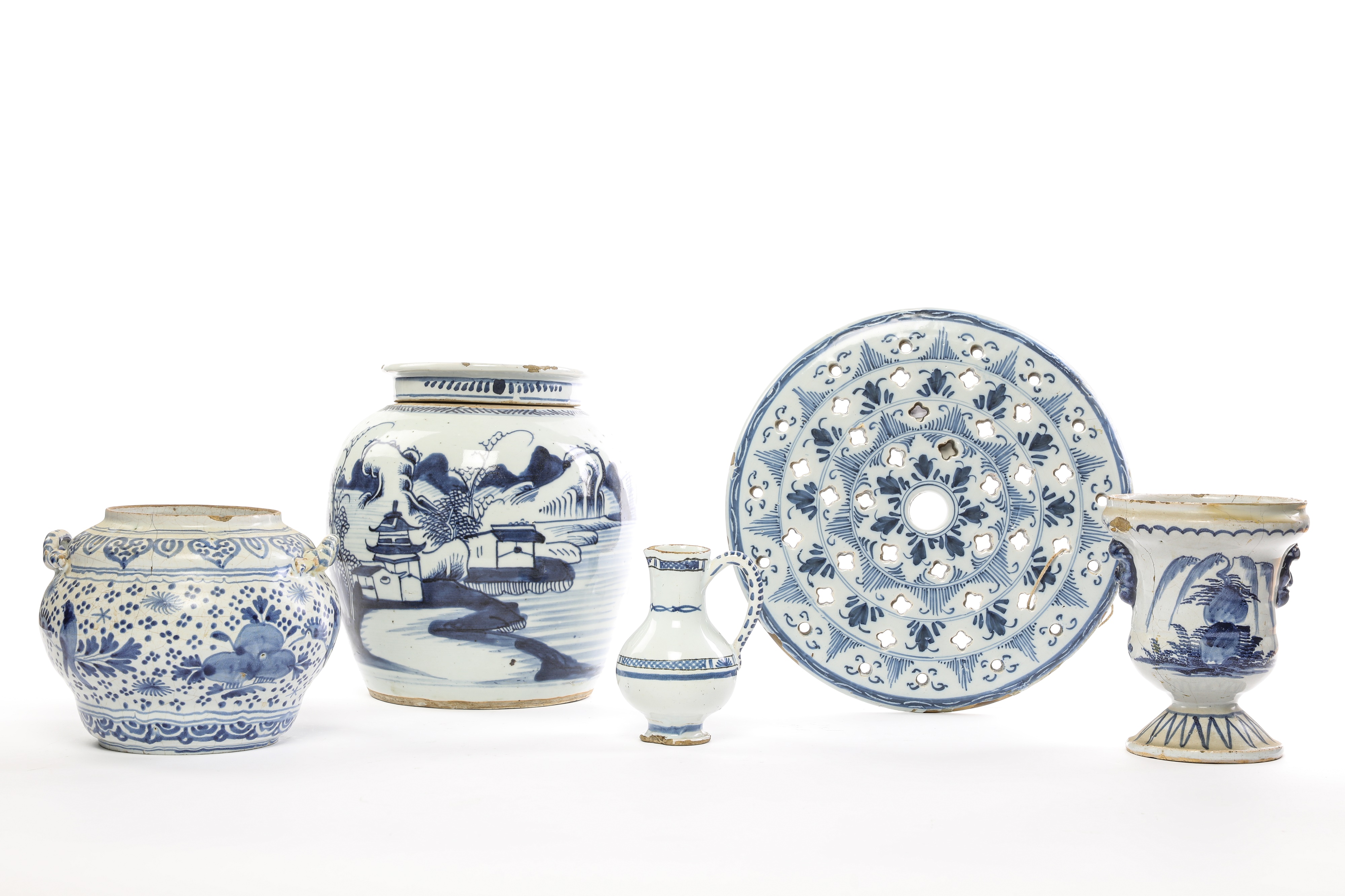 of two handled form, blue painted with birds and foliage, together with an urn painted with willow trees between mask handles, a strainer blue painted with foliage and grass and with four bands of holes around an aperture, a Continental faience jug and a Chinese blue and white ginger jar with a delftware cover (6)