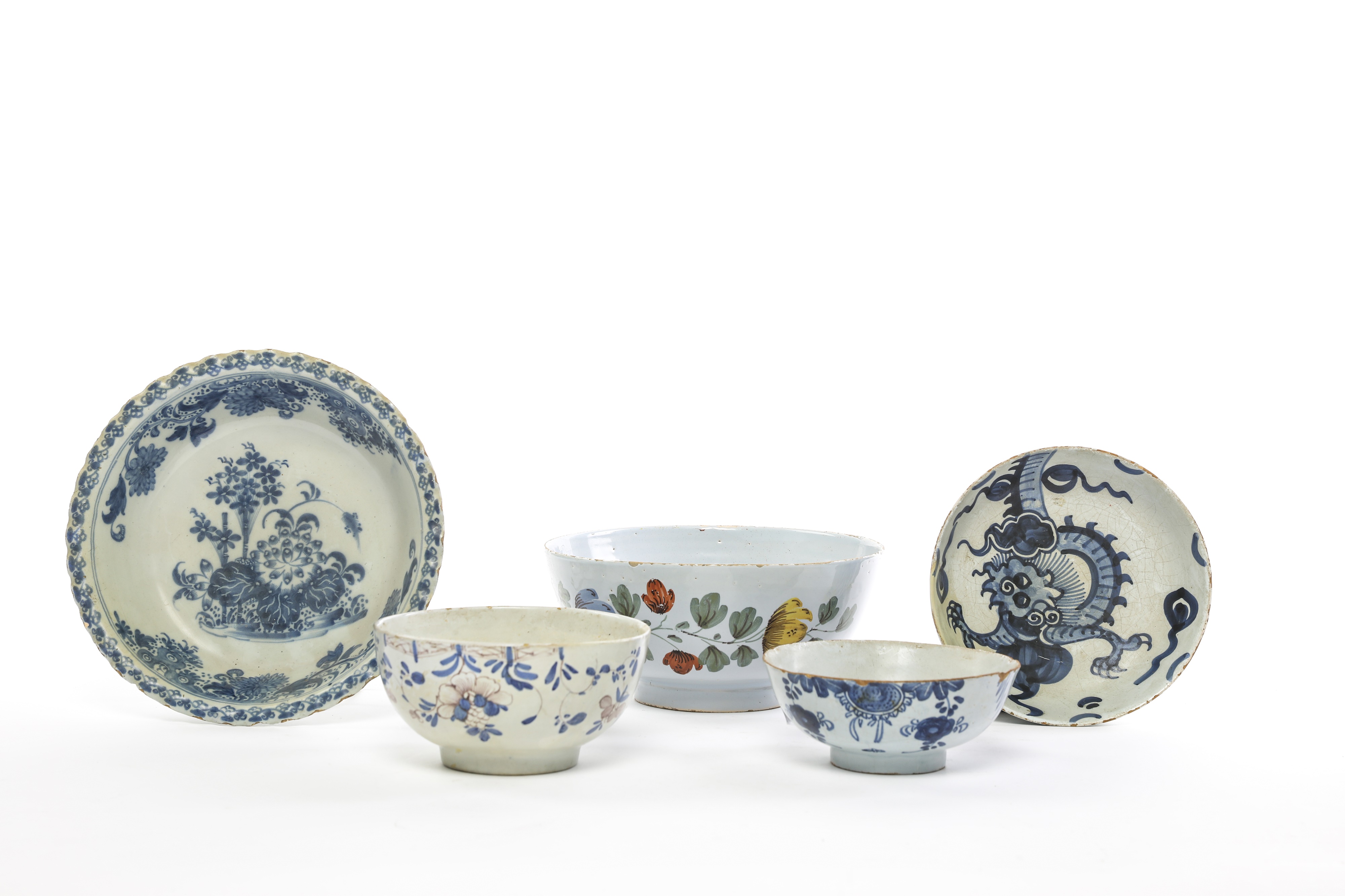 comprising: one painted in the Fazackerly palette with meandering flowers and a yellow fence, one with a crimped rim and blue painted with chinoiserie foliage, one with blue and manganese flowers and fence, one blue painted with a large Chinese dragon and one blue painted with flowering foliage (5)