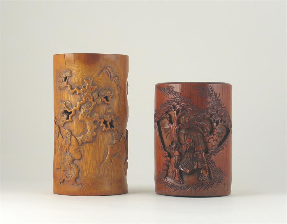 Two Chinese bamboo brushpots, both carved with figures beneath pine in rocky landscapes, 19th century, 22cm. (2)